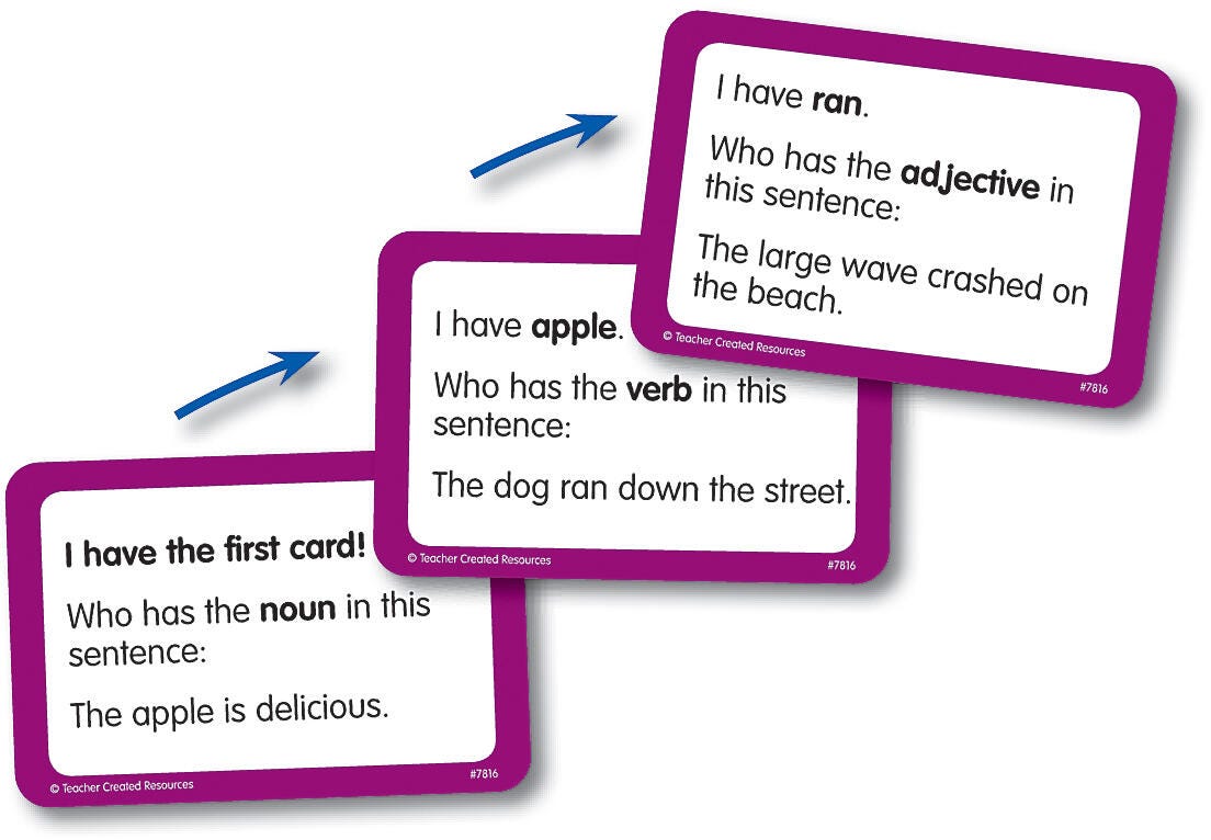 The entire class can have fun while practicing skills in signt words. Hand out all of the cards. The student whose card reads, “I have the first card! Who has…?” begins. The student whose card has the answer to that question responds and then asks a different question. This continues until the person with the last card gives the final answer and then reads, “This is the end of the game!” Each box provides 4 sets of cards for 4 different games.