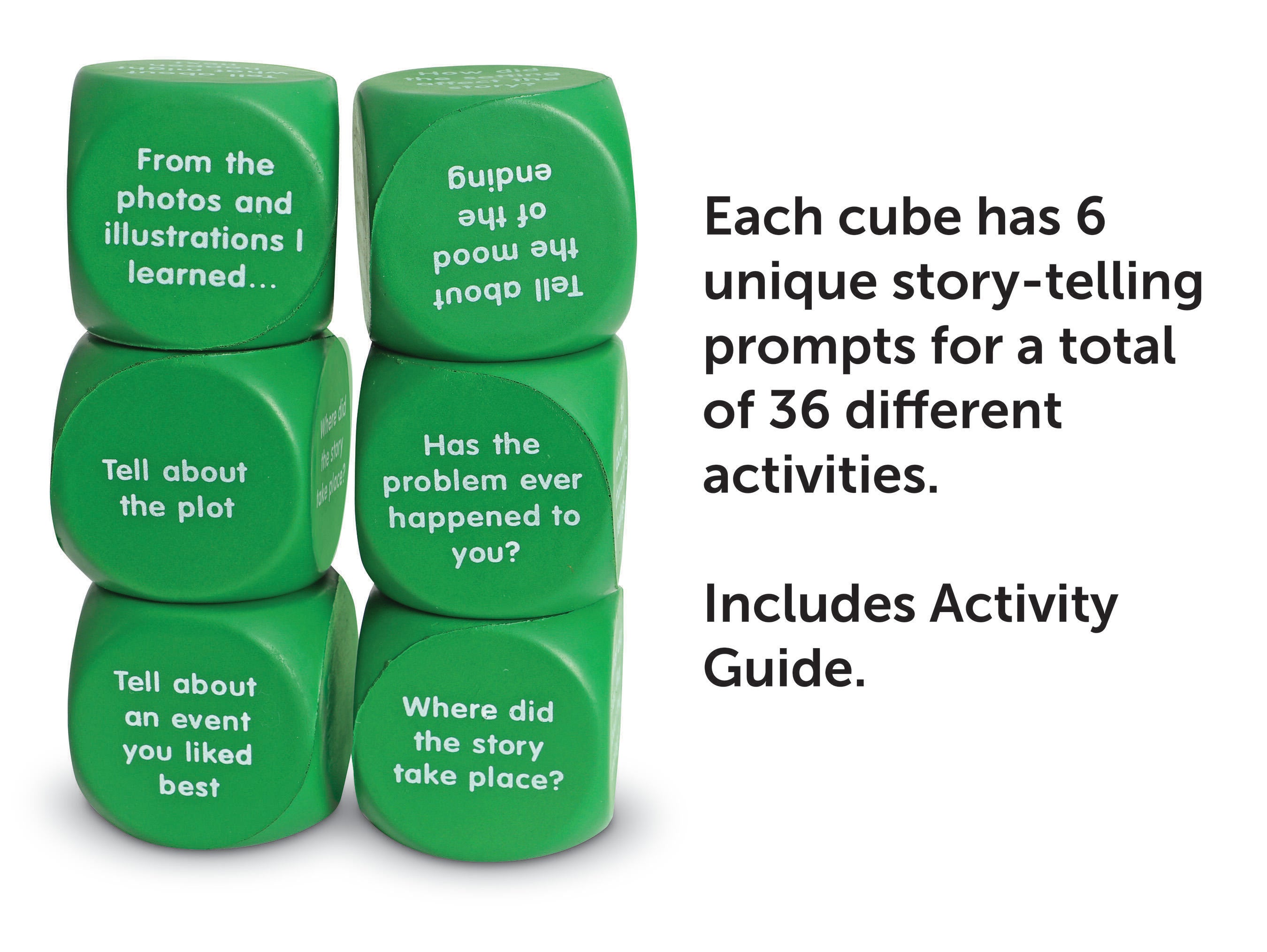 Learning Resources Retell a Story Cubes boost reading and listening comprehension while fostering creativity. The cubes feature 36 activities, with unique story retelling suggestions on each side. Use the color-coded cubes alone or in conjunction with the Reading Comprehension Cubes. Activity guide included. Cubes measure 1-5/8 L x 1-5/8 W inches. Recommended for ages 6 and up.