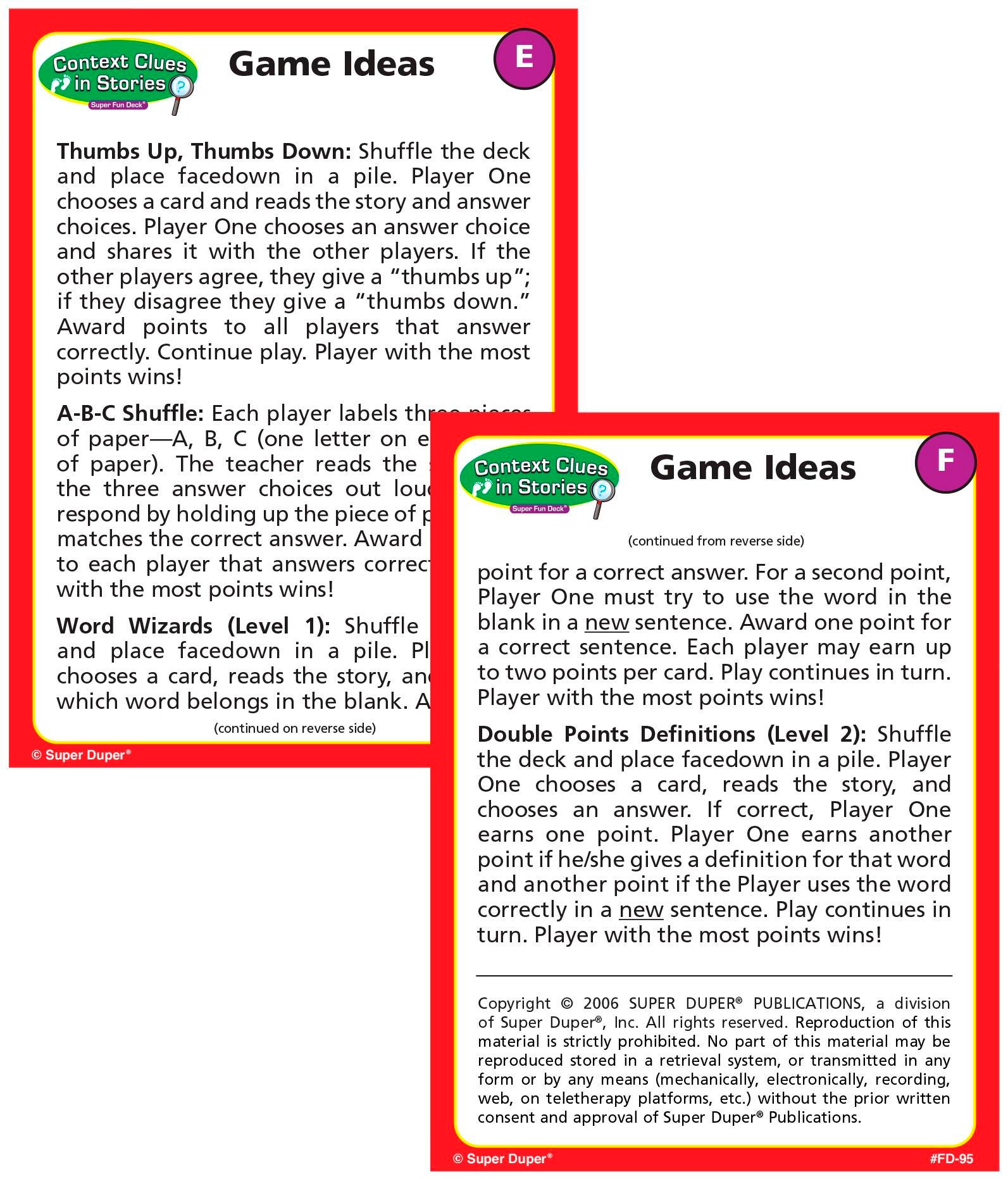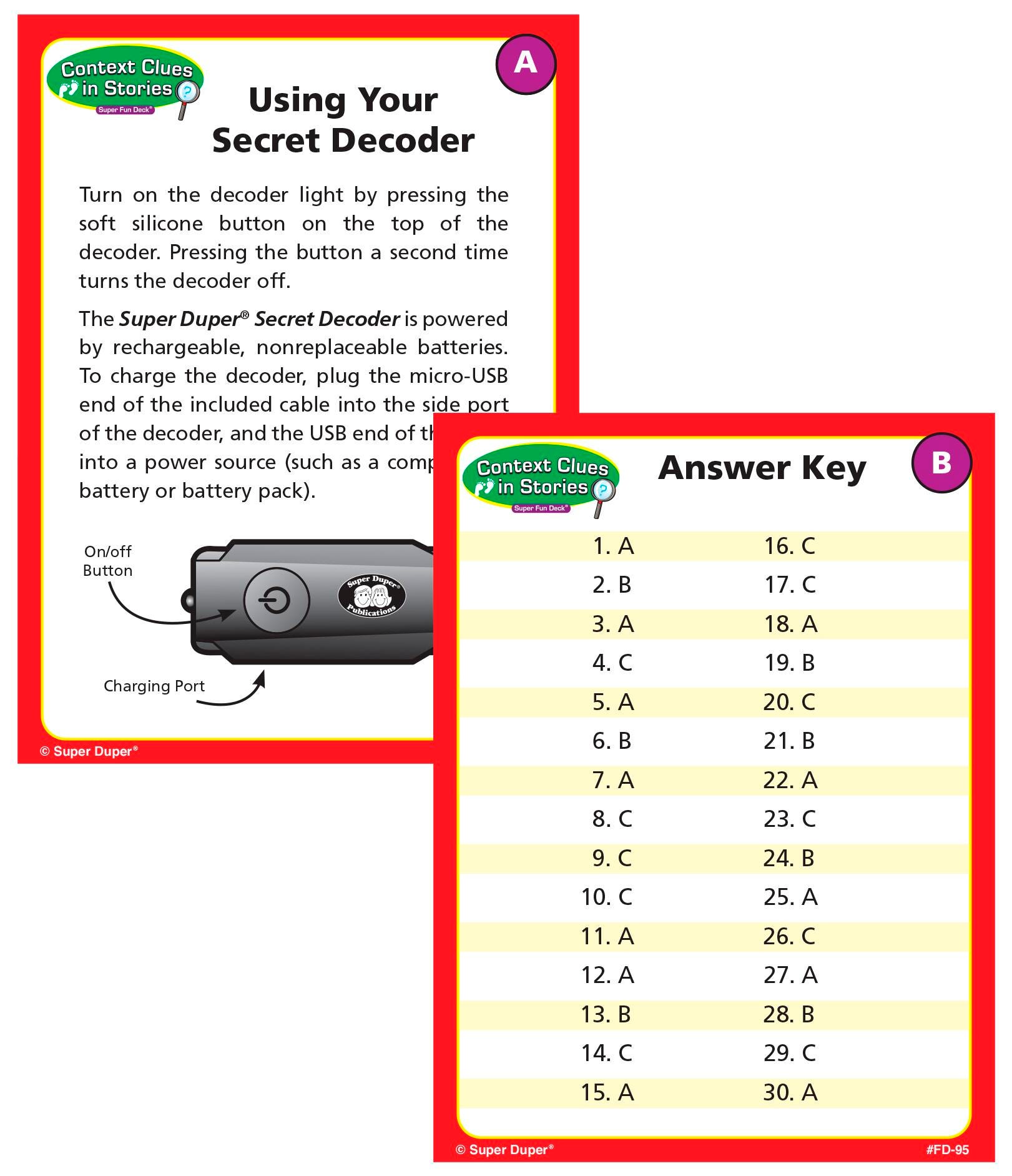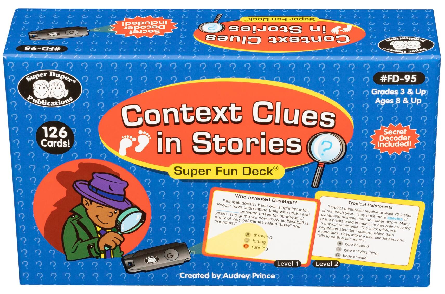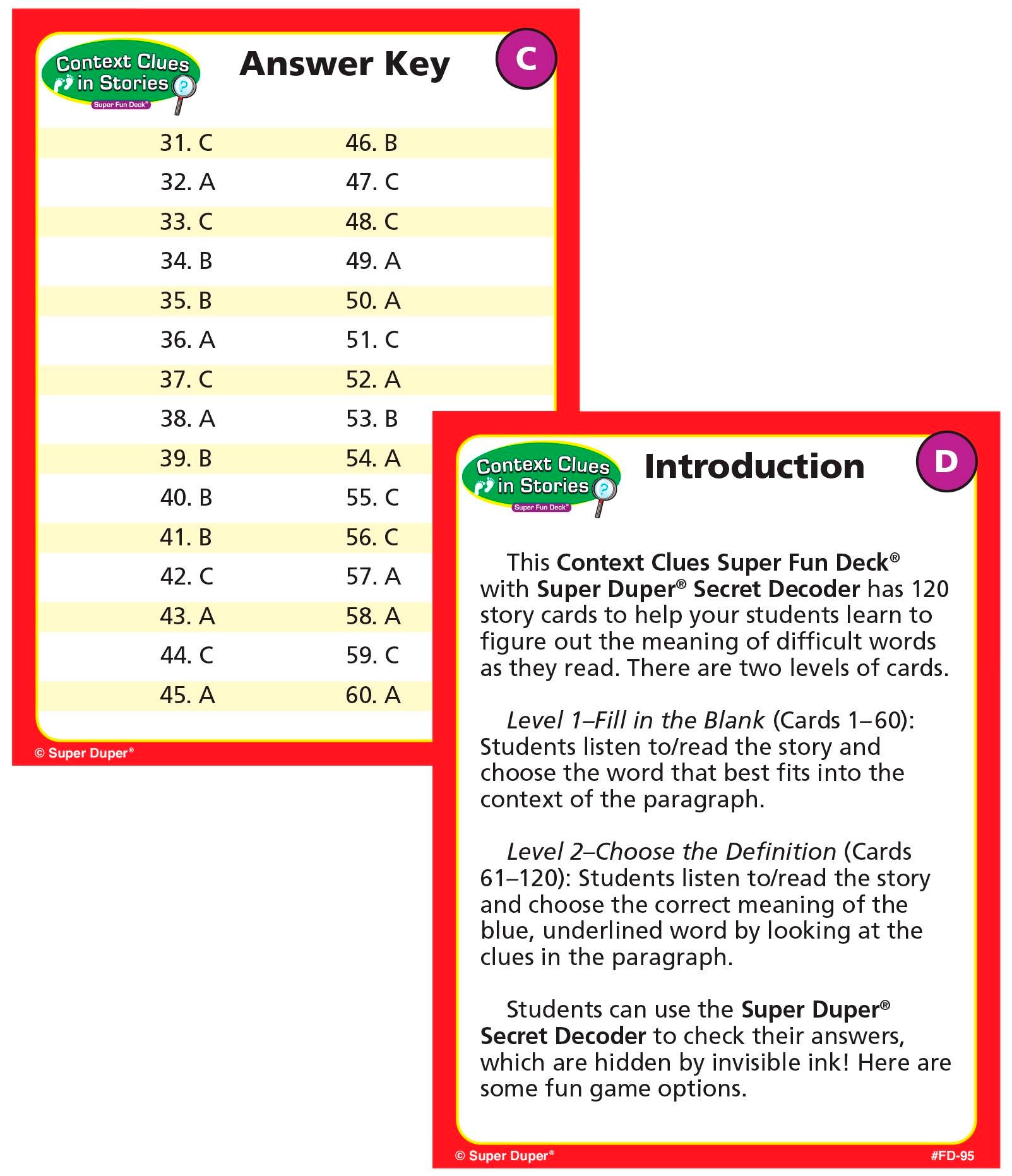 Description Context Clues in Stories Super Fun Deck with Super Duper Secret Decoder has 120 story cards to help your students learn to figure out the meaning of difficult words as they read. There are two levels of cards (4 L x 3 W in). Level 1- Fill In the Blank (cards #1-60) Students listen to/read the story and choose the word that best fits into the context of the paragraph. Level 2 -Choose the Definition (cards #61-120) Students listen to/read the story and choose the correct meaning of the blue, underlined word by looking at the clues in the paragraph. Level 2 -Choose the Definition (cards #61-120) Students listen to/read the story and choose the correct meaning of the blue, underlined word by looking at the clues in the paragraph. Students can self-check their answers with the Super Duper Secret Decoder. Just hold the decoder over the answer choices to reveal the correct answer highlighted with invisible ink! Free decoder included.