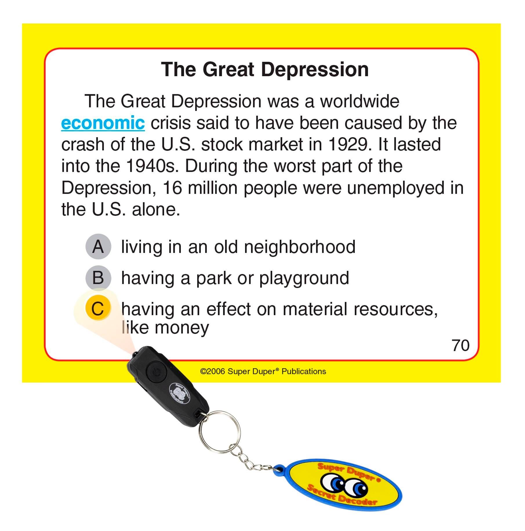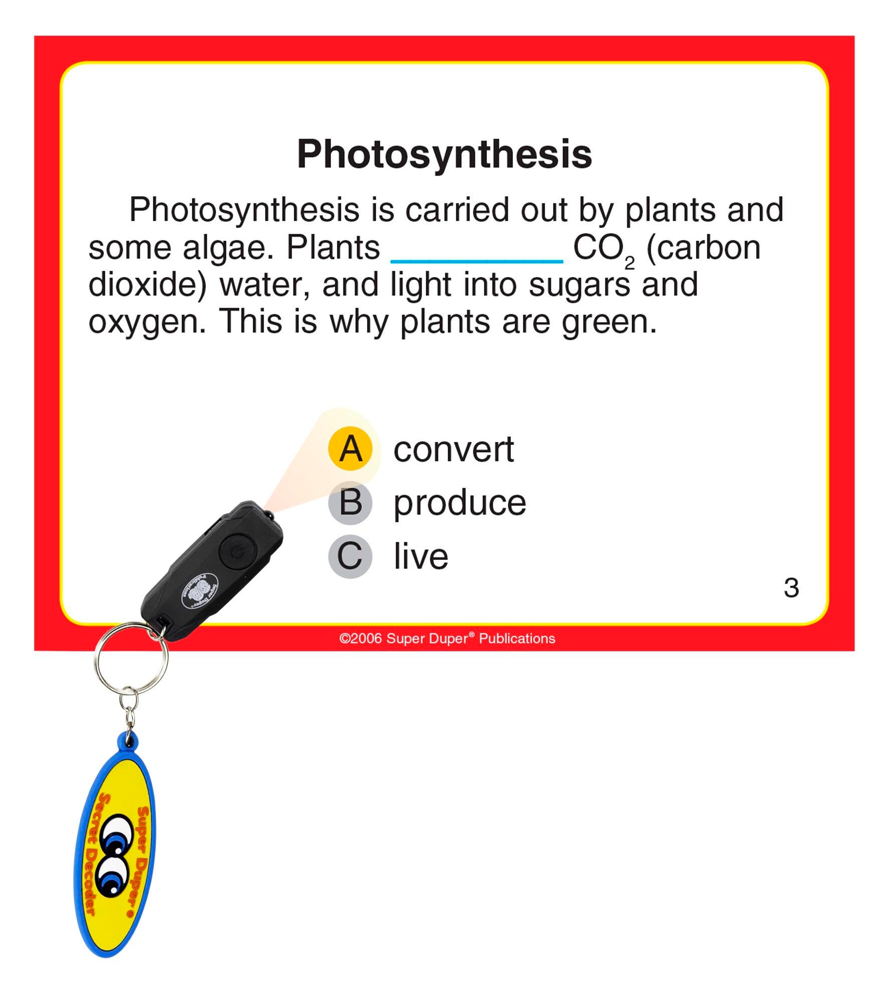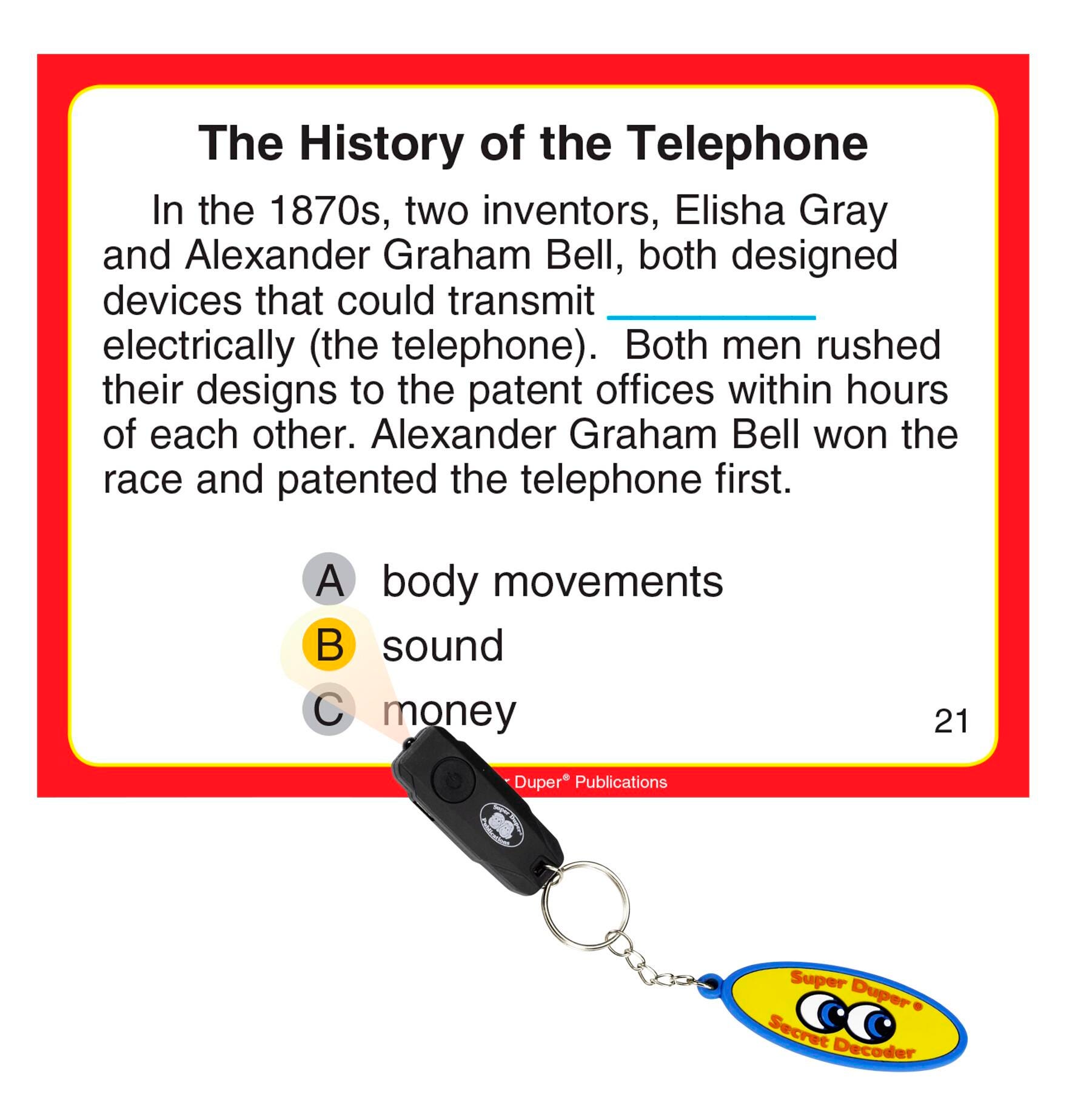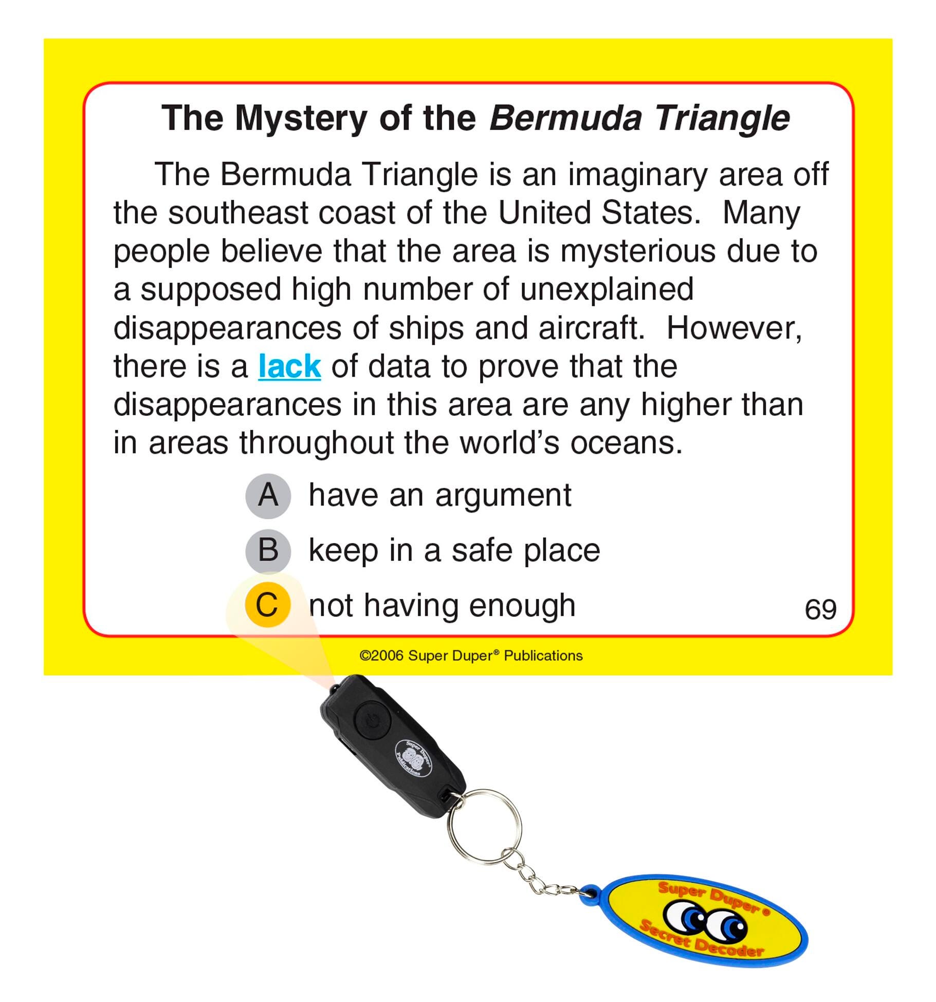 Description Context Clues in Stories Super Fun Deck with Super Duper Secret Decoder has 120 story cards to help your students learn to figure out the meaning of difficult words as they read. There are two levels of cards (4 L x 3 W in). Level 1- Fill In the Blank (cards #1-60) Students listen to/read the story and choose the word that best fits into the context of the paragraph. Level 2 -Choose the Definition (cards #61-120) Students listen to/read the story and choose the correct meaning of the blue, underlined word by looking at the clues in the paragraph. Level 2 -Choose the Definition (cards #61-120) Students listen to/read the story and choose the correct meaning of the blue, underlined word by looking at the clues in the paragraph. Students can self-check their answers with the Super Duper Secret Decoder. Just hold the decoder over the answer choices to reveal the correct answer highlighted with invisible ink! Free decoder included.