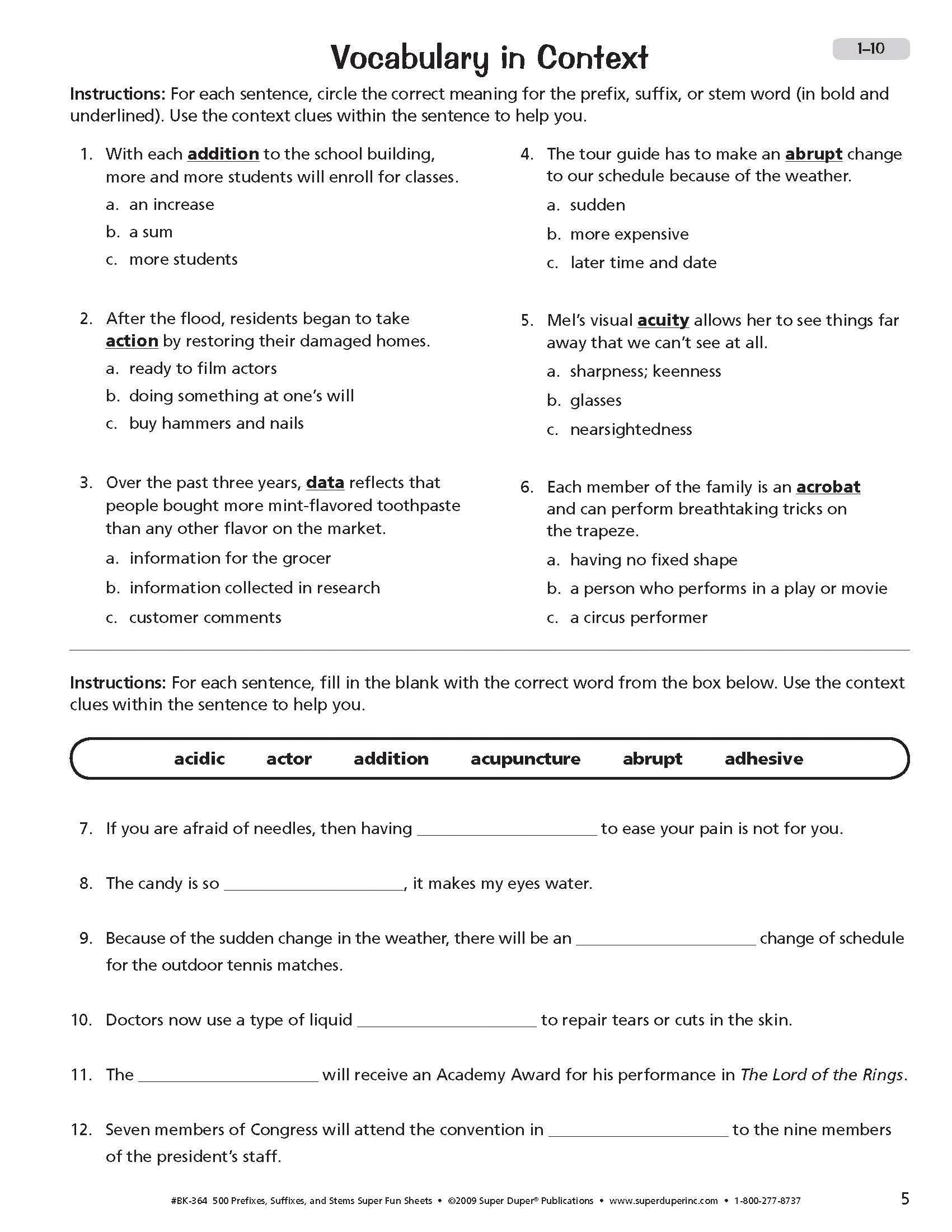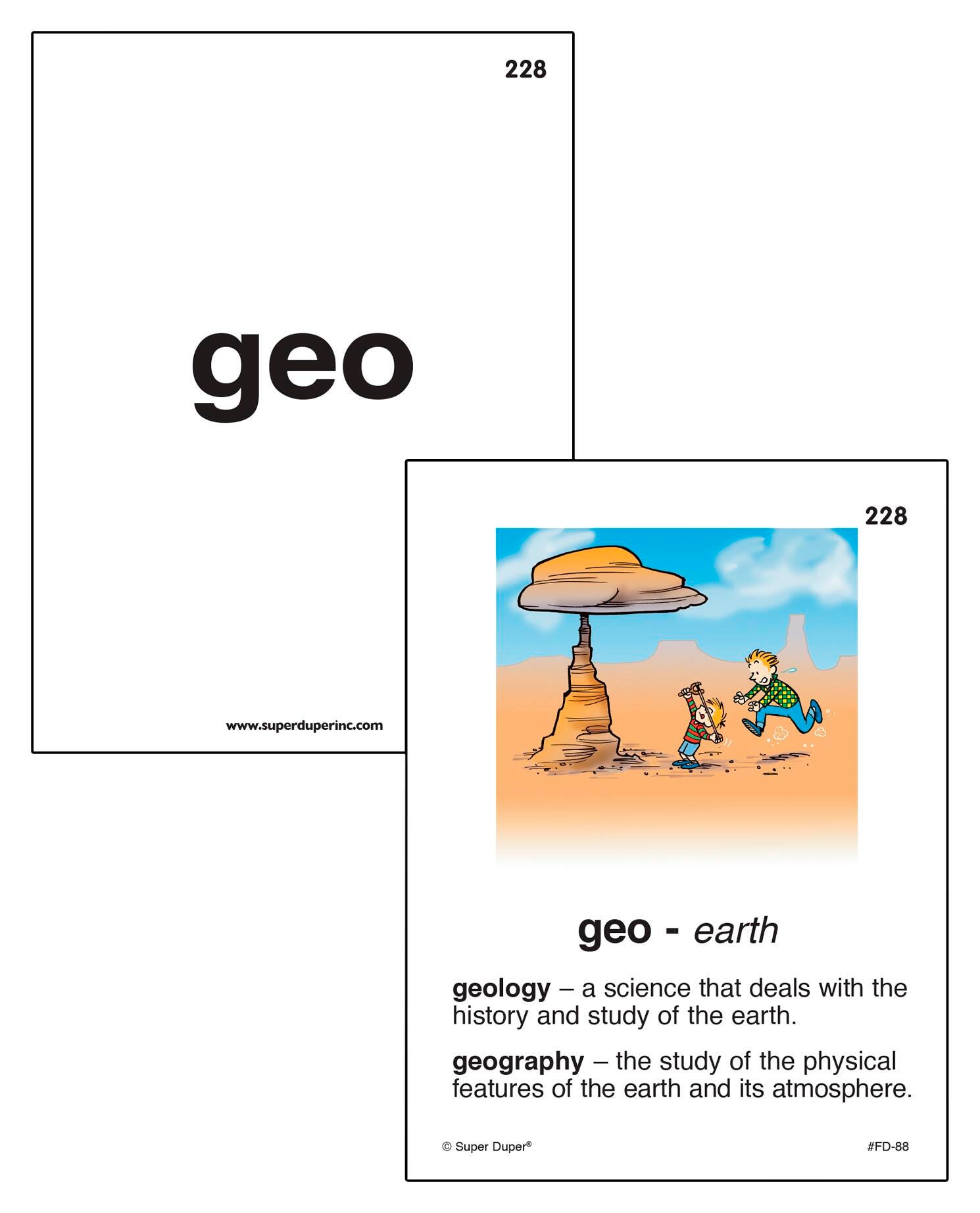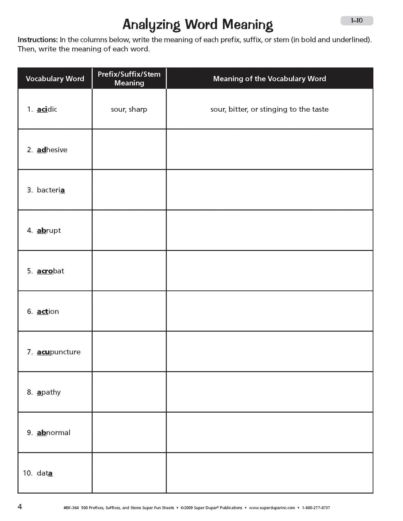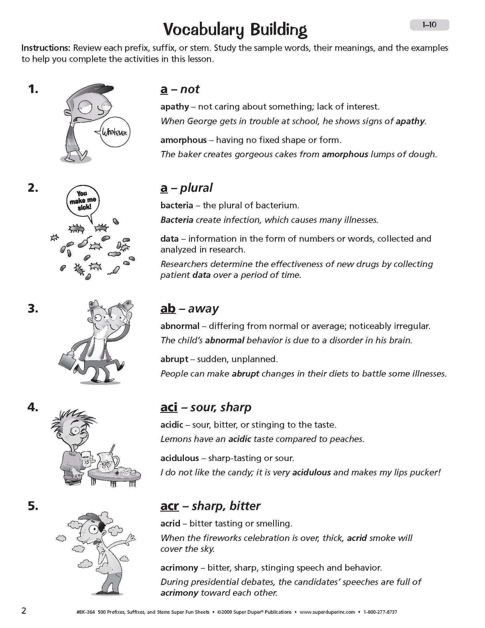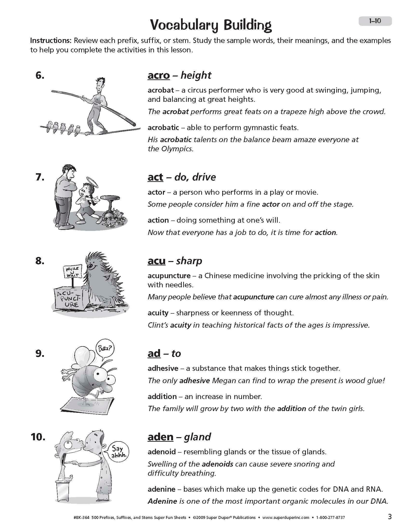 Knowing the meaning of various word parts can greatly expand your students' vocabulary and help them figure out the meanings of words they have never seen or heard before. Our 500 Prefixes, Suffixes, and Stems Super Fun Deck and Fun Sheets Combo provides 1000 vocabulary words and practice activities to help students understand and use these important word parts. The Super Fun Deck presents 500 illustrated prefixes, suffixes, and stems. One side of each card presents a word part and its meaning, along with two words (using the word part) and their definitions. A whimsical picture helps illustrate the first word. Use this side of the card to teach the word parts. The other side is a flashcard to test your students' knowledge. Cards measure 4 L x 3 W in and come packaged in a sturdy storage box for easy travel. The 328-page companion book provides multiple contexts for students to learn and remember Greek, Latin, and other word parts (agro-, cogn-, hum-, mega-, ped-, syn-, etc.). Each of the 50 chapters in the Super Fun Sheets book contains six reproducible worksheets. Each chapter ends with a quiz to use as an assessment or student review. The answer key, located at the back of the book, makes checking students’ work quick and easy.