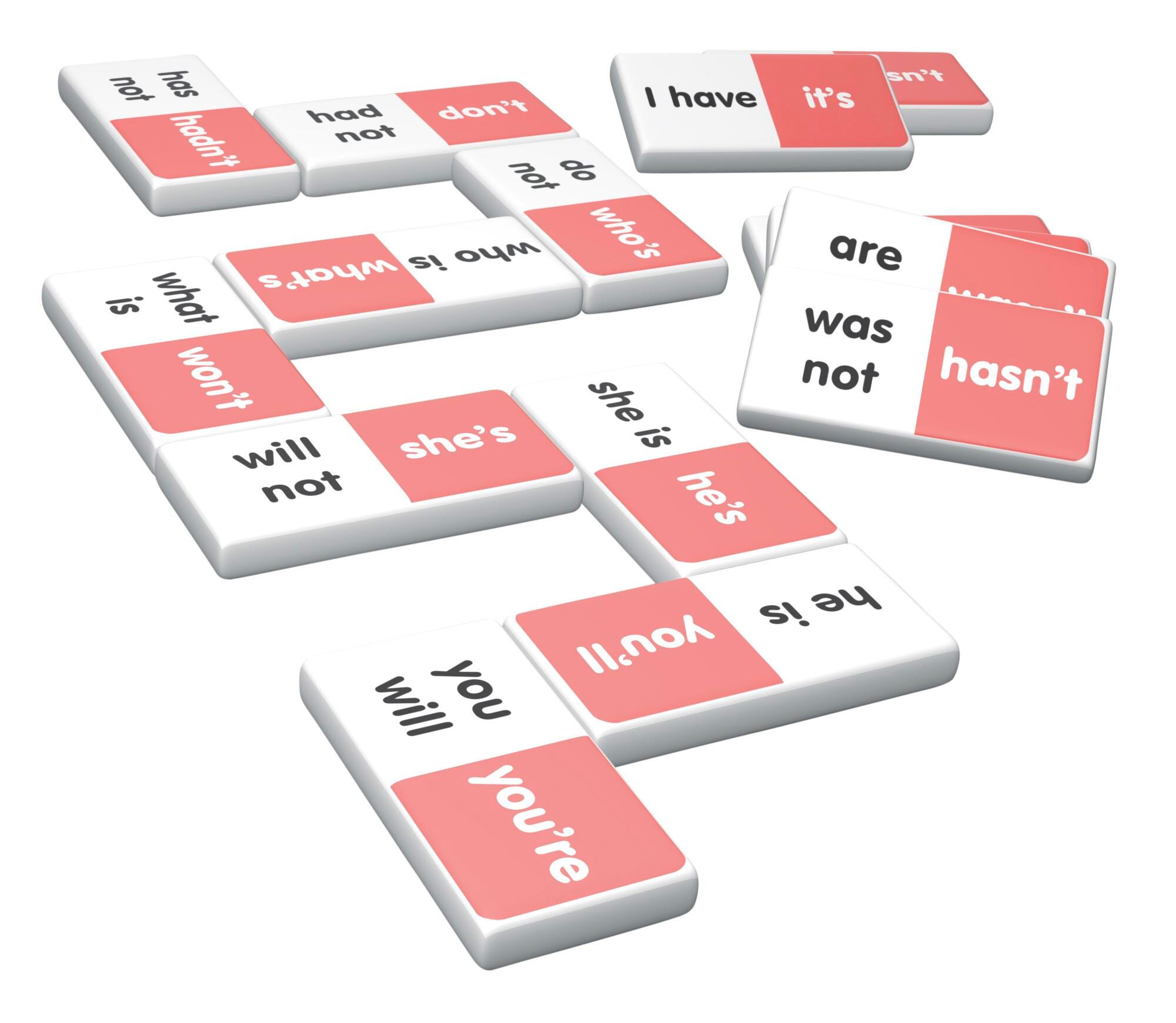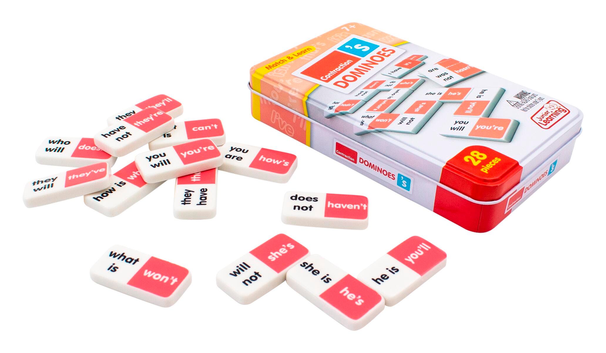 Contraction dominoes include a 28 piece set on thick plastic dominoes. Dominoes come in a collectors tin for storage. Children will love the feel of real dominoes as they complete the contractions matching game.Features
