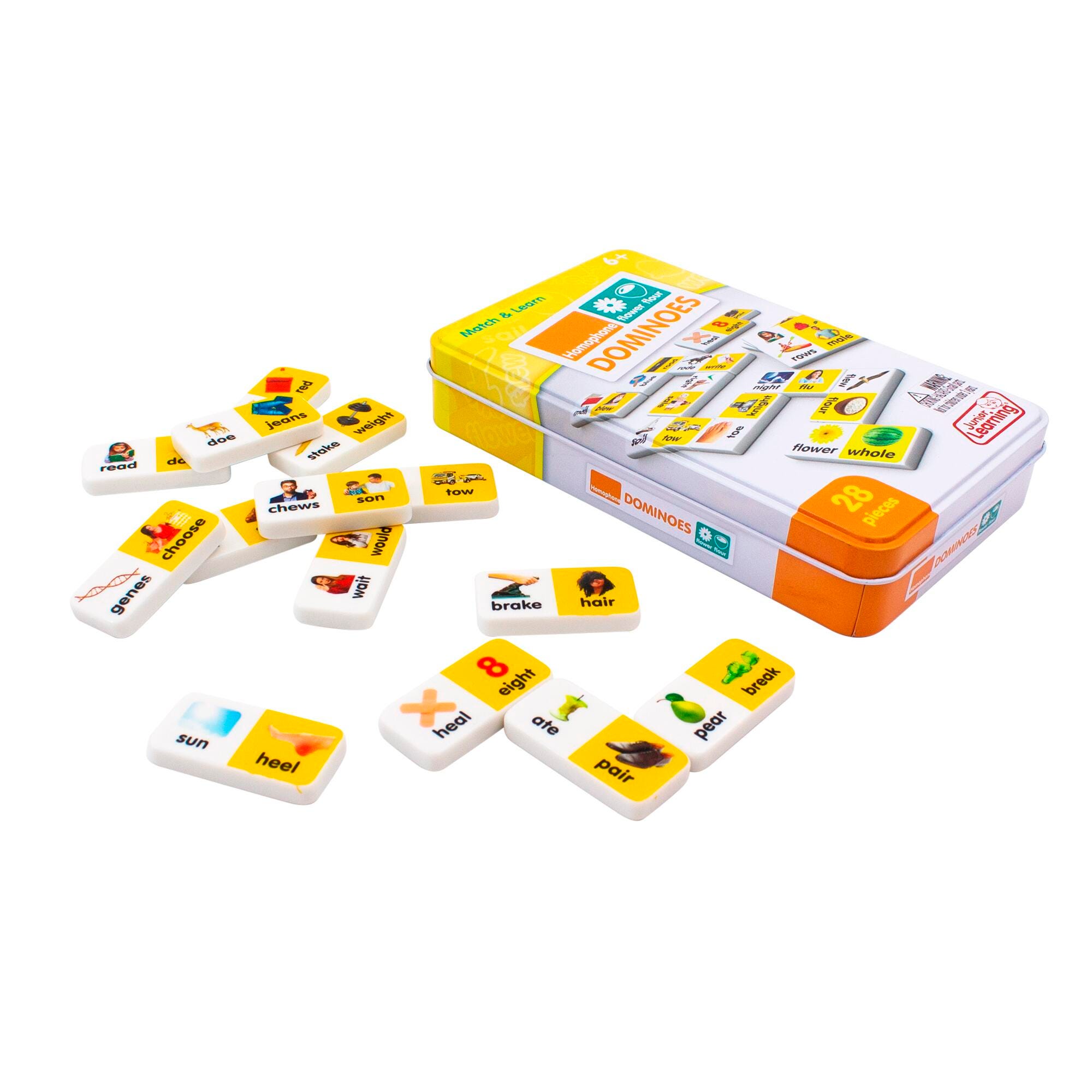 Homophone dominoes include a 28 piece set on thick plastic dominoes. Dominoes come in a collectors tin for storage. Children will love the feel of real dominoes as they complete the homophone matching game.Features
