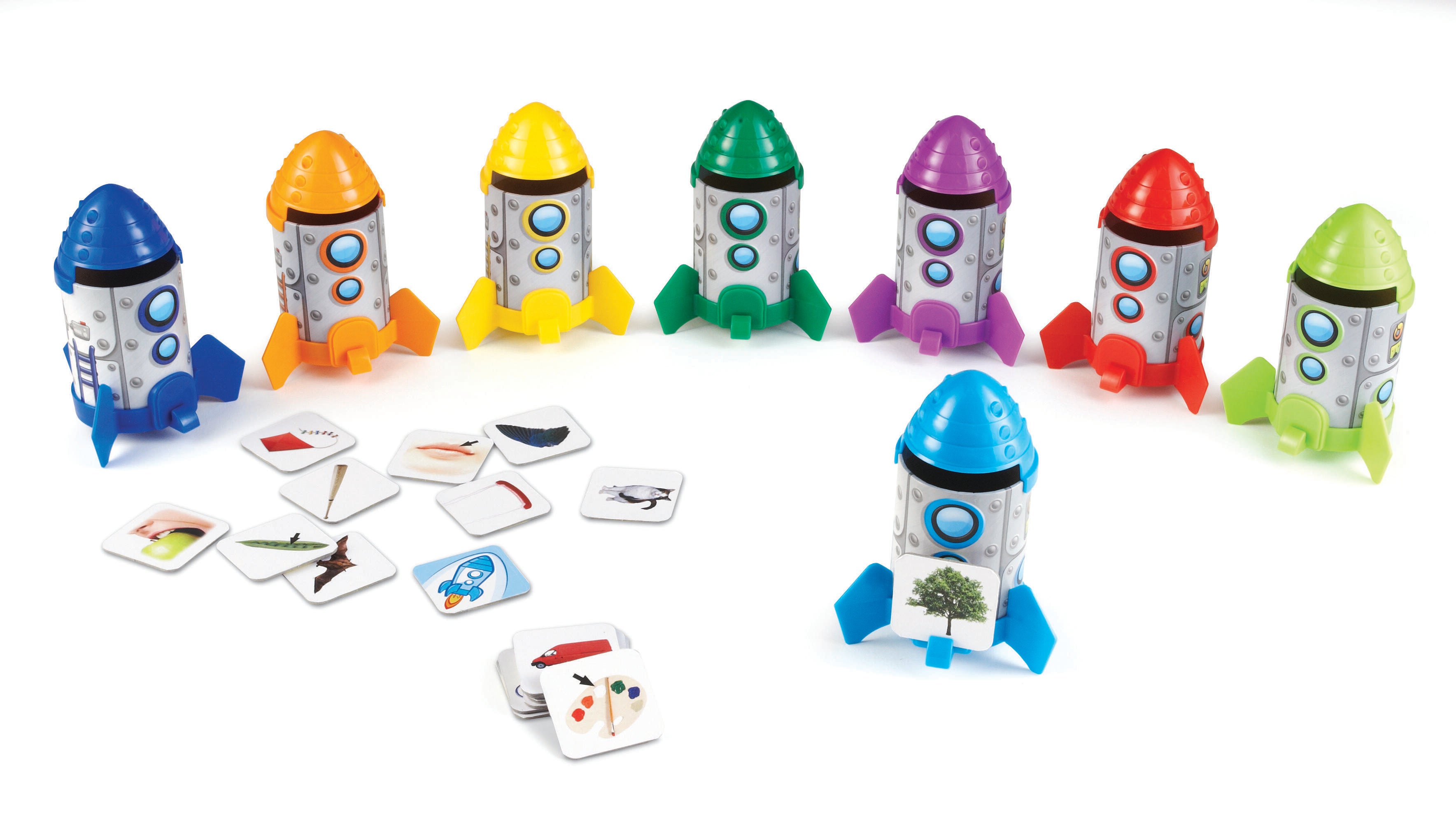 Description Learning Resources Rhyme and Sort Rockets let kids have a blast reinforcing phonological awareness! Place a photo card in the rocket doorway, then sort cards that rhyme into the correct rocket. Sort by beginning and ending sounds, syllables and more! Rockets that measure 5 H x 2-1/4 D inches. Designed for grades PreK and up.Features Helps children learn about rhyming Increases visual sensory development Easy for small hands to grasp Increases dexterity and fine motor skills Includes: 8 Rockets 80 Real-Life Photo Cards Activity Guide