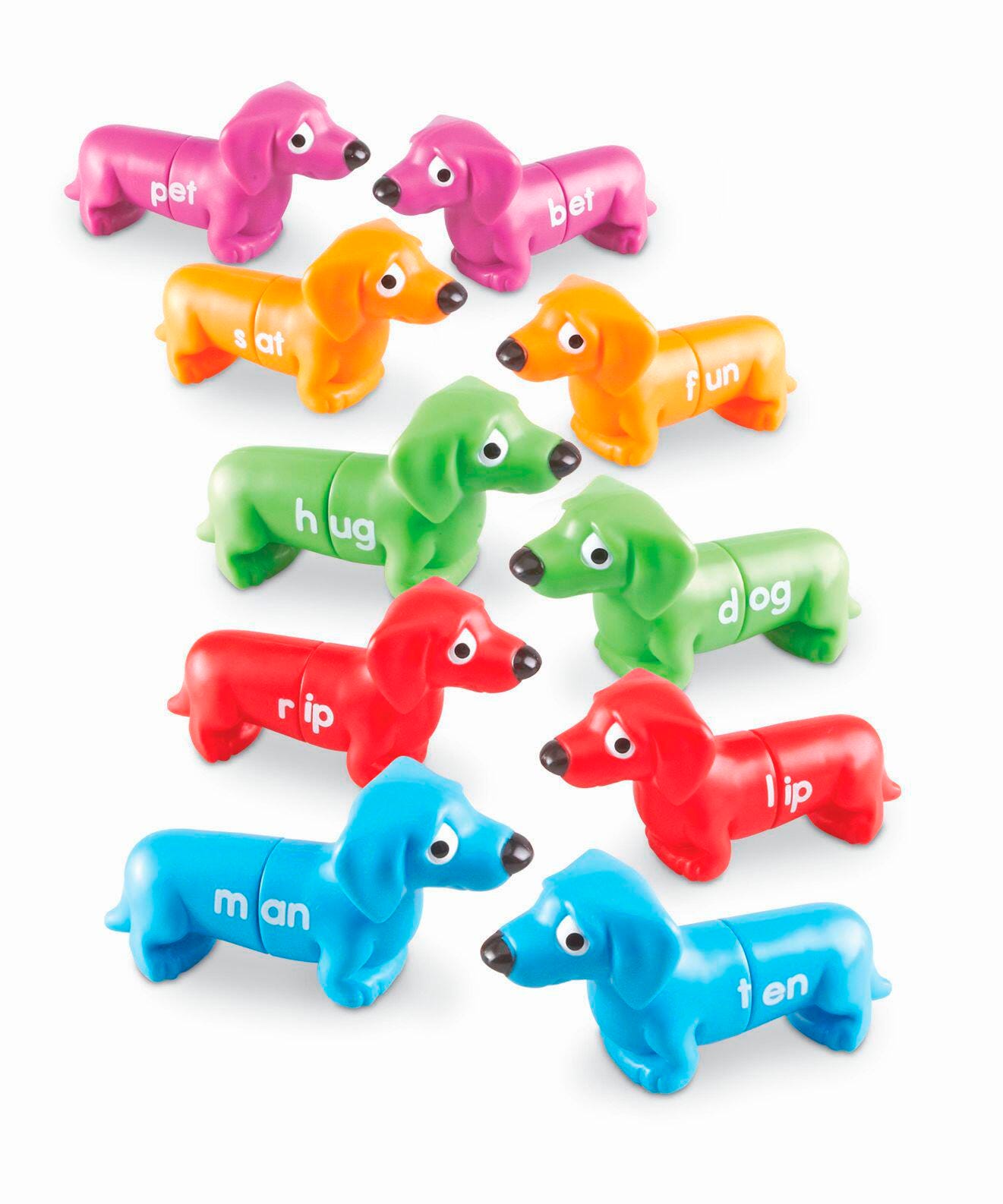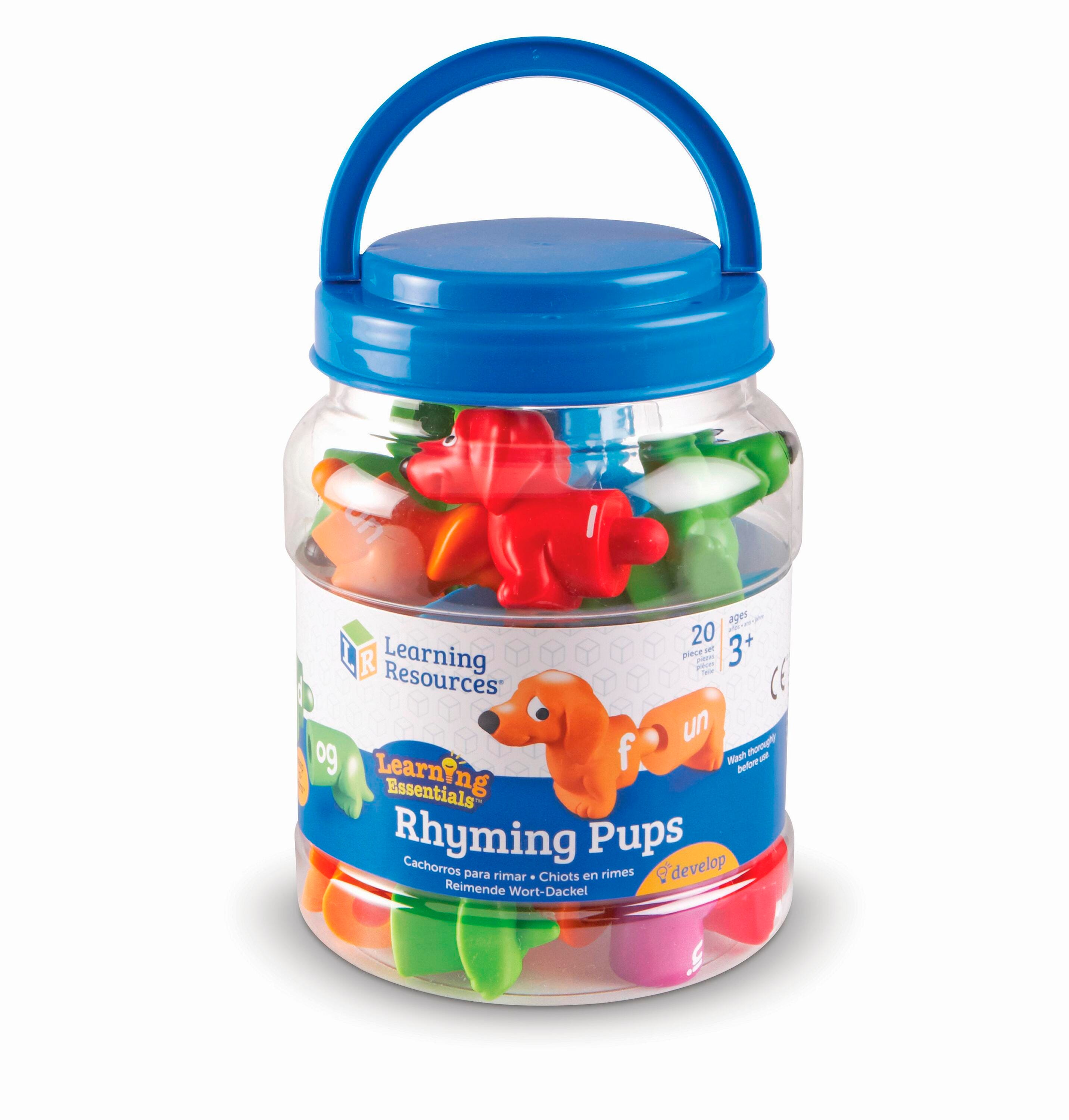 Learning Resources Snap-n-Learn Rhyming Pups are adorable puppy friends that snap together to make rhyming words! Set includes ten puppy heads with beginning letters and ten puppy tails with two letter word endings that can be mixed and matched to make lots of rhyming words. Puppies (when combind together front and back) measure 4-1/4 L x 2 W inches. Ages 3 to 7.
