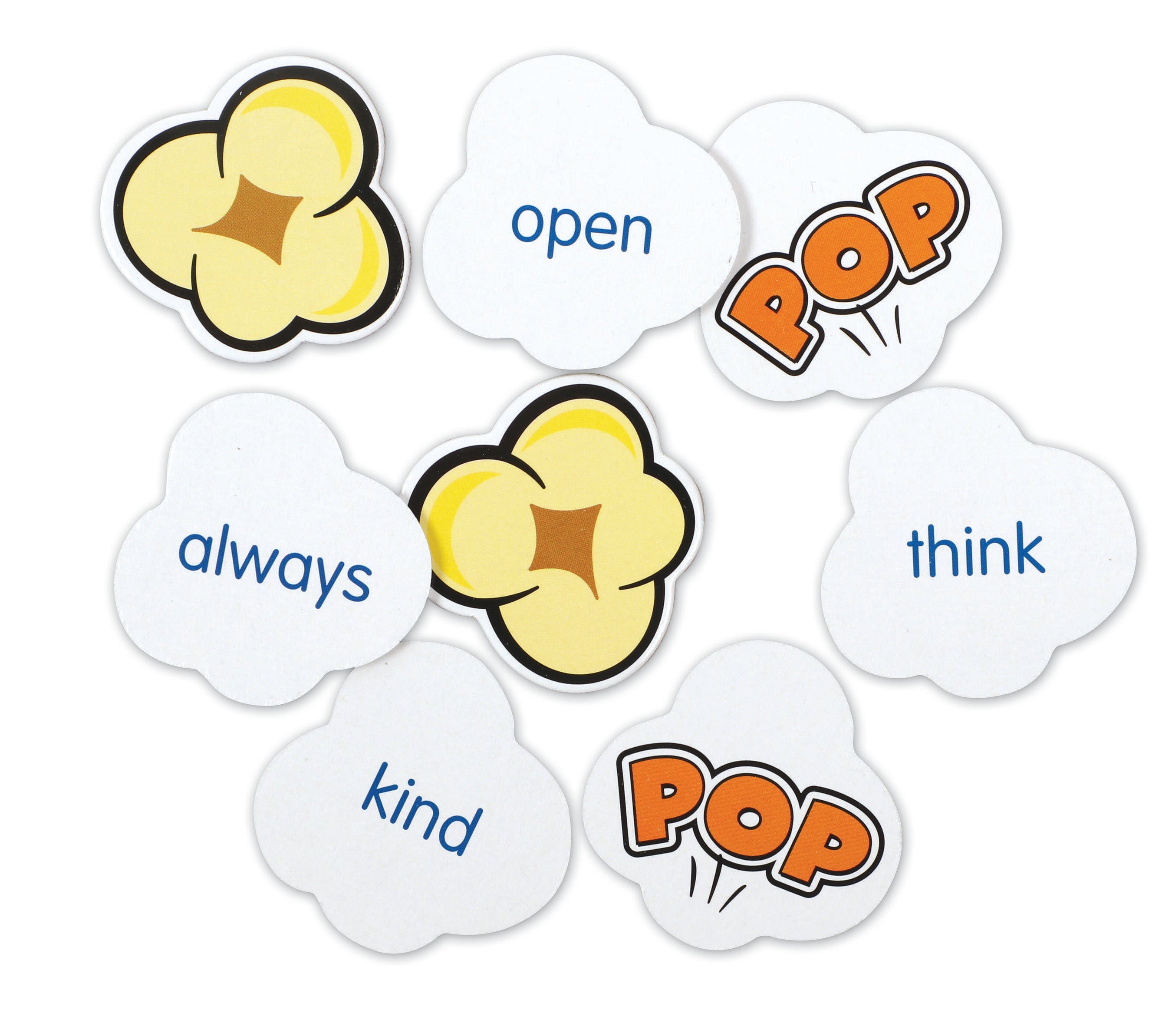 Set of 100 die-cut popcorn card game pieces include 92 sight words and 8 POP cards (that means player should put a sight word piece into popcorn bucket)