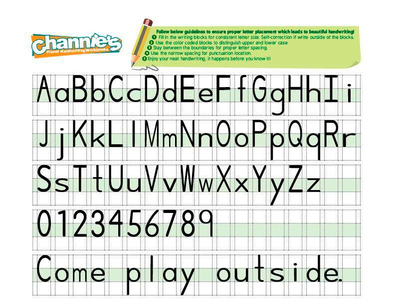 Perfect for a daily journal in the classroom or drawing and expressing your child's imagination at home. Channie's unique 3 block color coded system takes the stress out of writing neat letters and words. With 80 printed practice pages your PreK-1st grade child will be off to a great start on legible penmanship. Each page has one area above for drawing a picture and a writing area below for writing something about what was drawn. Blocks aid with consistent letter size and proportion between upper and lower-case writing, spacing, punctuation placement, and keeps writing flowing in straight lines. THE Best VISUAL handwriting workbook for beginners. 40 sheets printed front and back. Measures 8 x 11-1/2 inches.