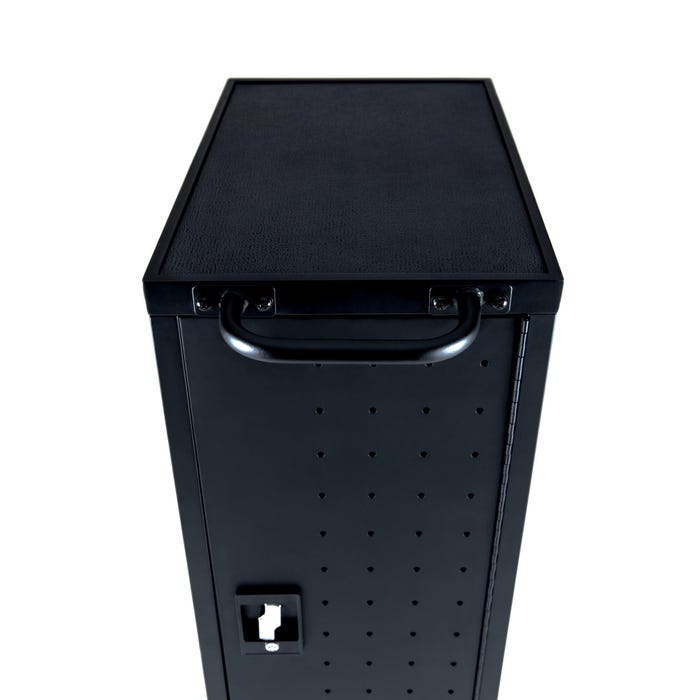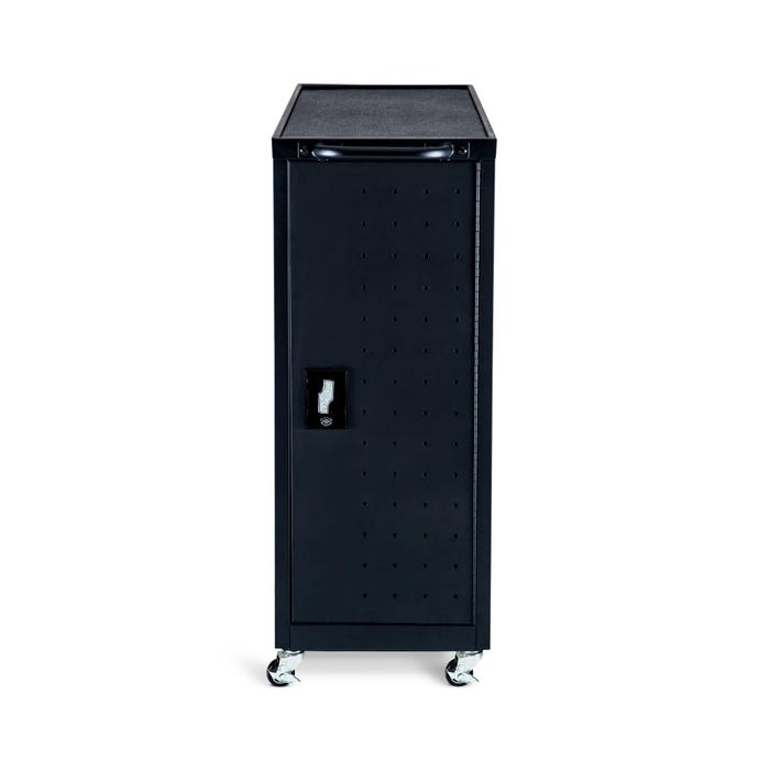 Find the perfect tablet and Chromebook charging cart for your classroom, library, AV tech room, office, or anywhere you need fully-charged devices on hand. When not in use, this charging cart acts as secure tech storage with locking doors and all-steel construction. Overall measurements with handle measure 14 W x 24-3/4 D x 39-5/8 H inches. Shelves measures 13-3/4 W x 16 D inches with 12 H of top clearance for plenty of storage space. Divider slots measure 1-3/4 inches. Cord length measures 10 feet. Maximum weight capacity of 75 pounds (evenly distributed). Ships mostly assembled. Simply add the handle and the wheels and you're ready to roll.Features