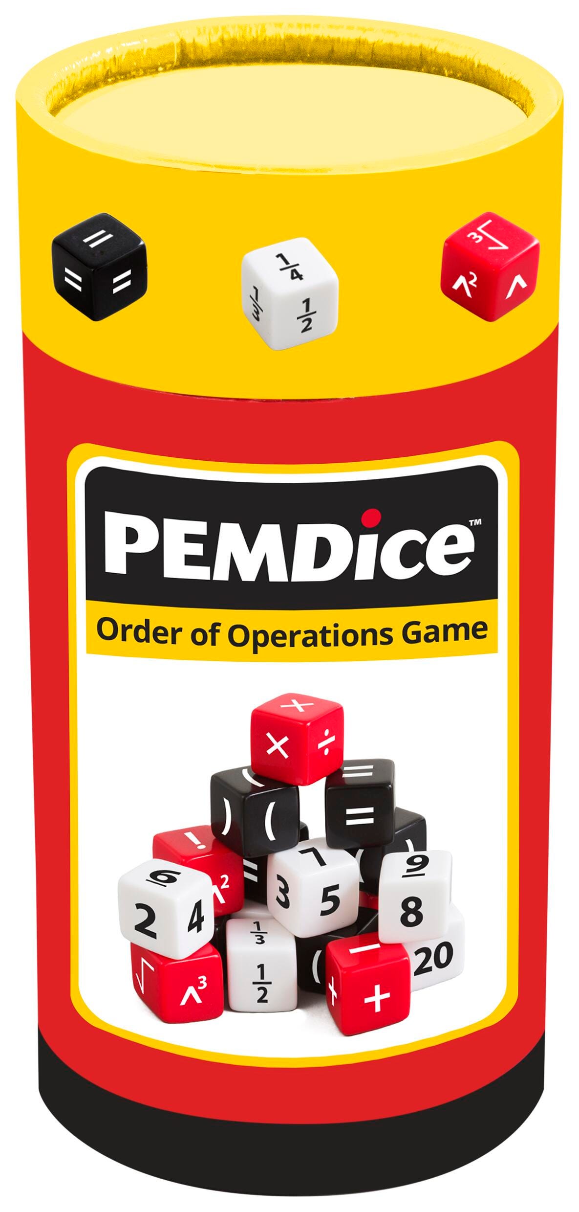 Roll the PEMDice and create equations—just be sure they’re correct and follow the mathematical order or operations! Earn points by creating equations that use the most dice. These unique dice feature numbers, fractions (1⁄2, 1⁄3, 1⁄4), operations, parentheses, and equal signs. Game includes 30 unique color-coded PEMDice, activity guide with a variety of game options, and shaker. For two students.Features