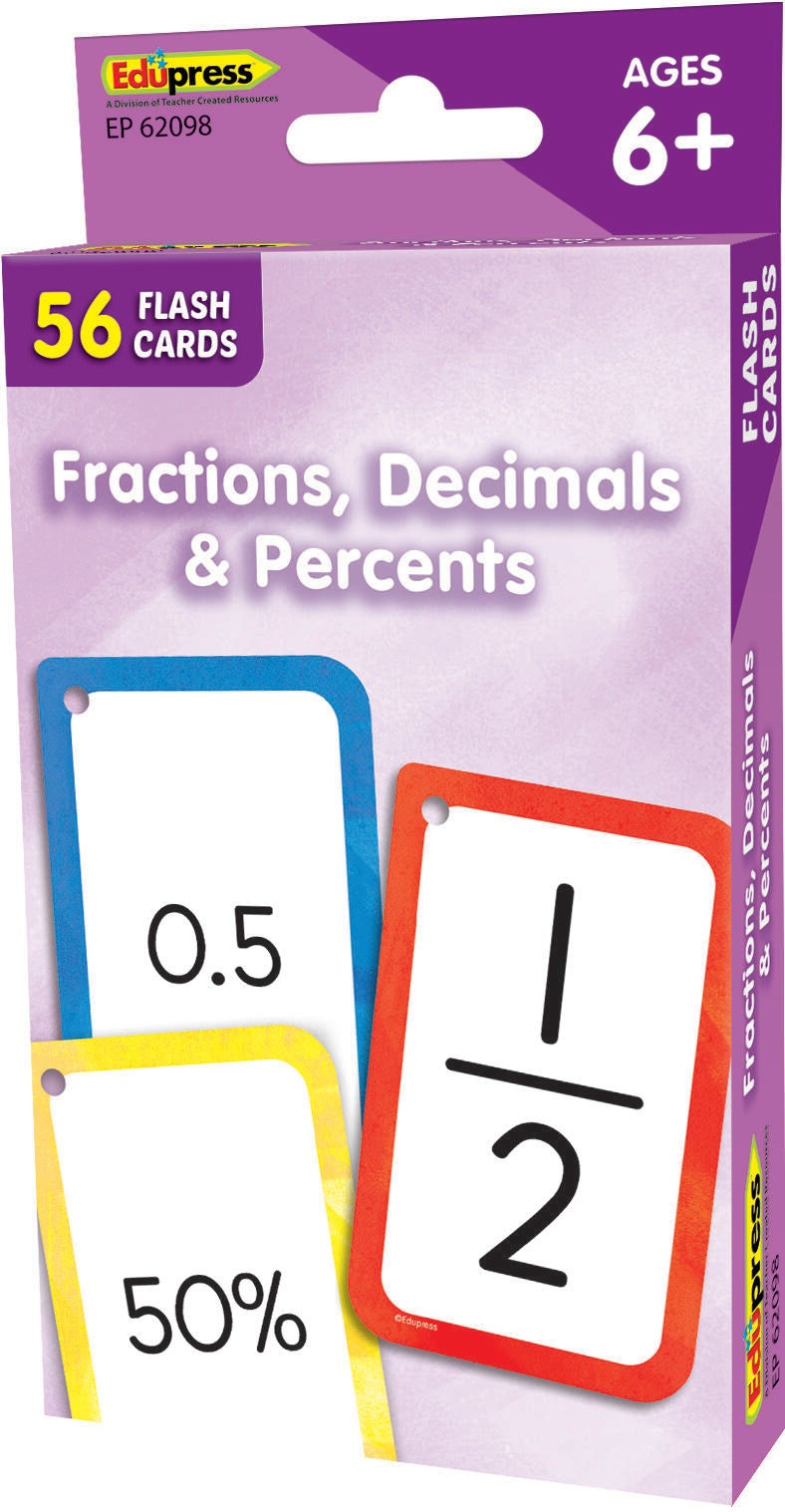 Young math learners will love practicing their skills with these handy Fractions, Decimals, & Percents Flash Cards. This set includes 14 fractional numbers shown as fractions, pictures, percentages, and decimals that students can identify and match for comprehensive learning. The full-color cards are engaging and easy for children to read and understand. Each flashcard has a hole punched in the top corner for simple organization and storage. The cards also feature non-rounded, quick-sorting corners that make it easy to face the cards in the same direction. This flashcard set includes student cards, instructions and tips for educators, and suggested activities. This set includes 56 cards, each measuring 3-1/8 x 5-1/8 inches.