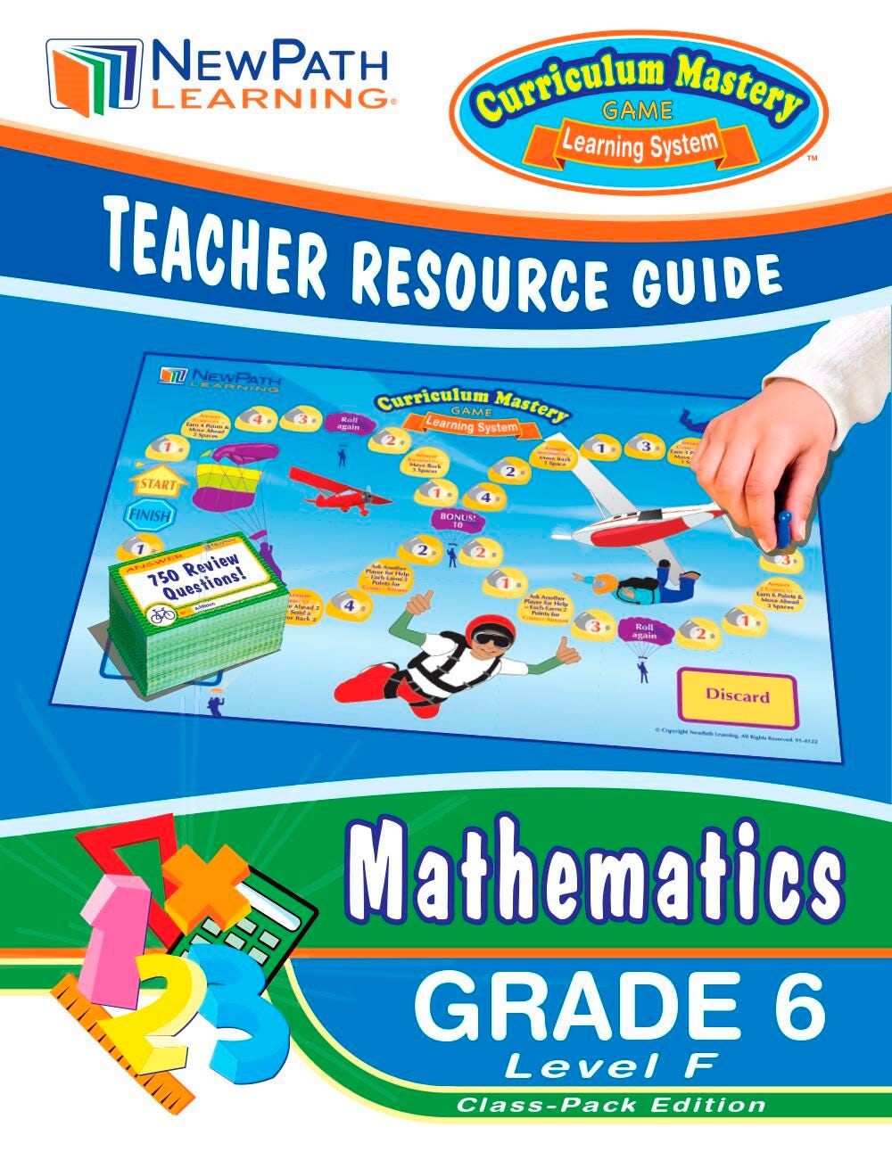 The NewPath Learning Grade 6 Math Curriculum Mastery Take-Home Game is written by teachers using research-based principles and student-tested. The Take-Home Game features 25 individually packaged games, each covering a separate, standards-based topic. Each of the 25 games include a game board, a set of 30 review cards, materials for up to 4 players and instructions for the students/parents – all packaged in a durable vinyl folder, ready to take home! Also includes comprehensive teacher planning/resource guide and a free 1-year Premium Class Online Subscription to access interactive content, activities and assessments. Covers: Whole Numbers to Trillions; Commutative/Associative Properties; Distributive Property; Proportions/Equivalent Fractions; Percents; Ordering Fractions; Add/Subtract Fractions; Multiply/Divide Fractions; Mixed Numbers; Rational Numbers; Percent, Rate, Base; Order of Operations; Repeated Multiplication; Exponents; Evaluate Exponents; One & Two Step Functions; Evaluate Formulas; Simple Proportions; Area of Triangles & Quadrilaterals; Area and Circumference of Circles; Plotting Points; Area of Coordinate Polygons; Measurement Conversion; Statistics; and Graphs.