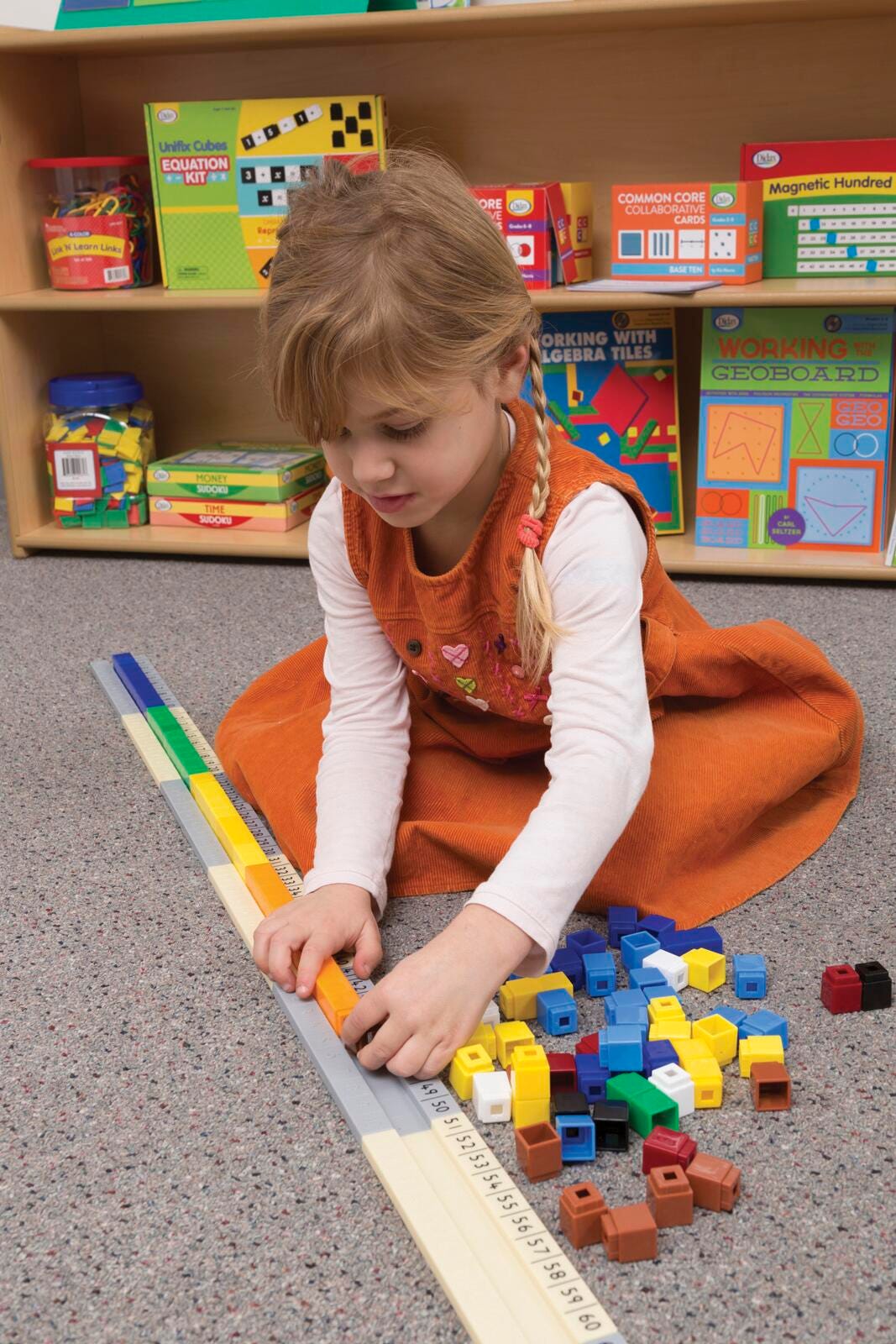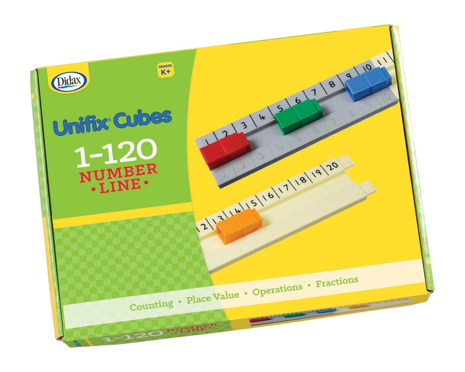 Didax Unifix 1-120 Number Line ideal for grades K - 2 is designed for use with unifix cubes and includes teaching notes with CCSS alignment. 7 ft Number line is divided into sections so that it can be connected as needed depending on the desired usage where each section of the line measures 2-1/4 in L x 7-1/4 in W when fully assembled. The number line enables children to count, compare, add, subtract and visualize place value concepts.