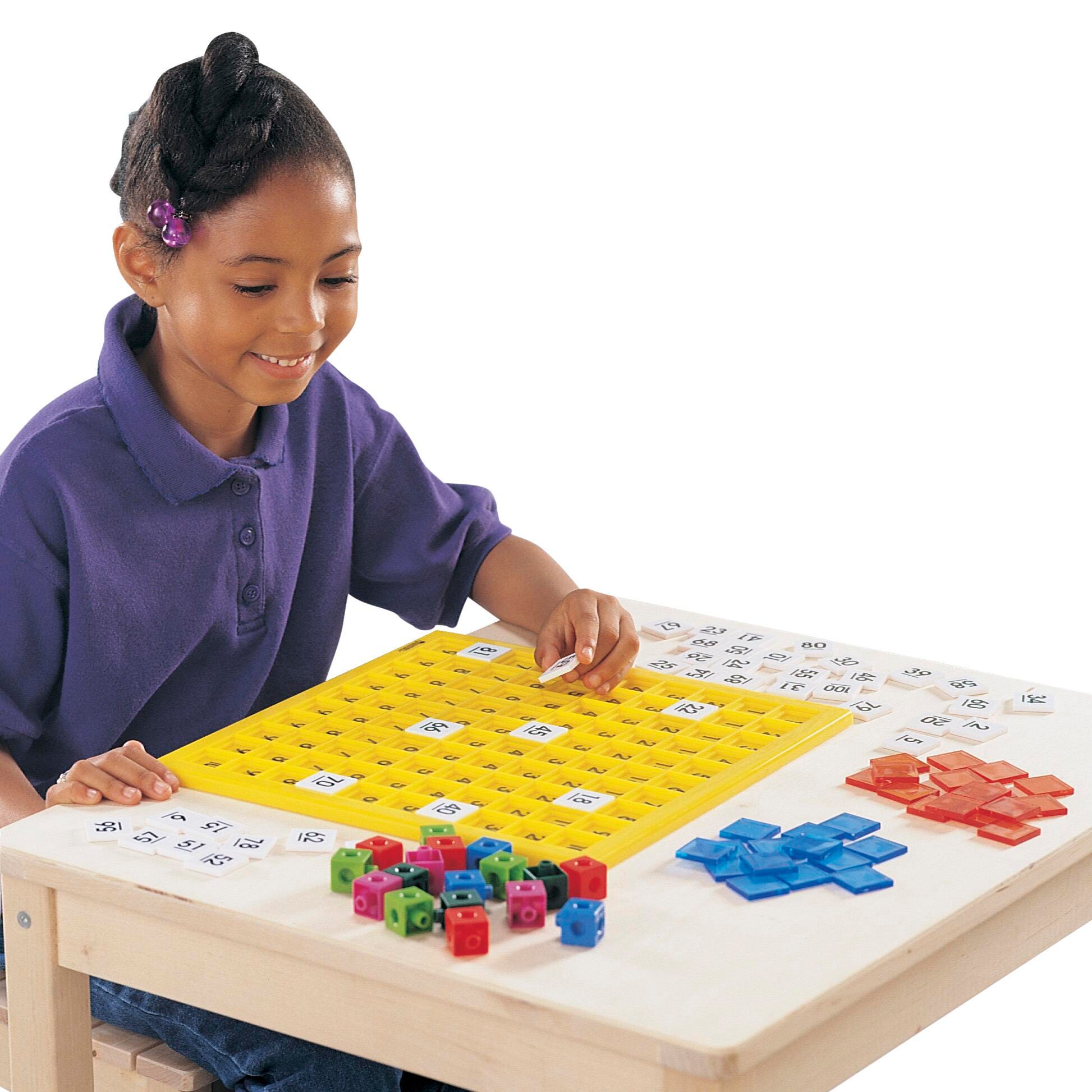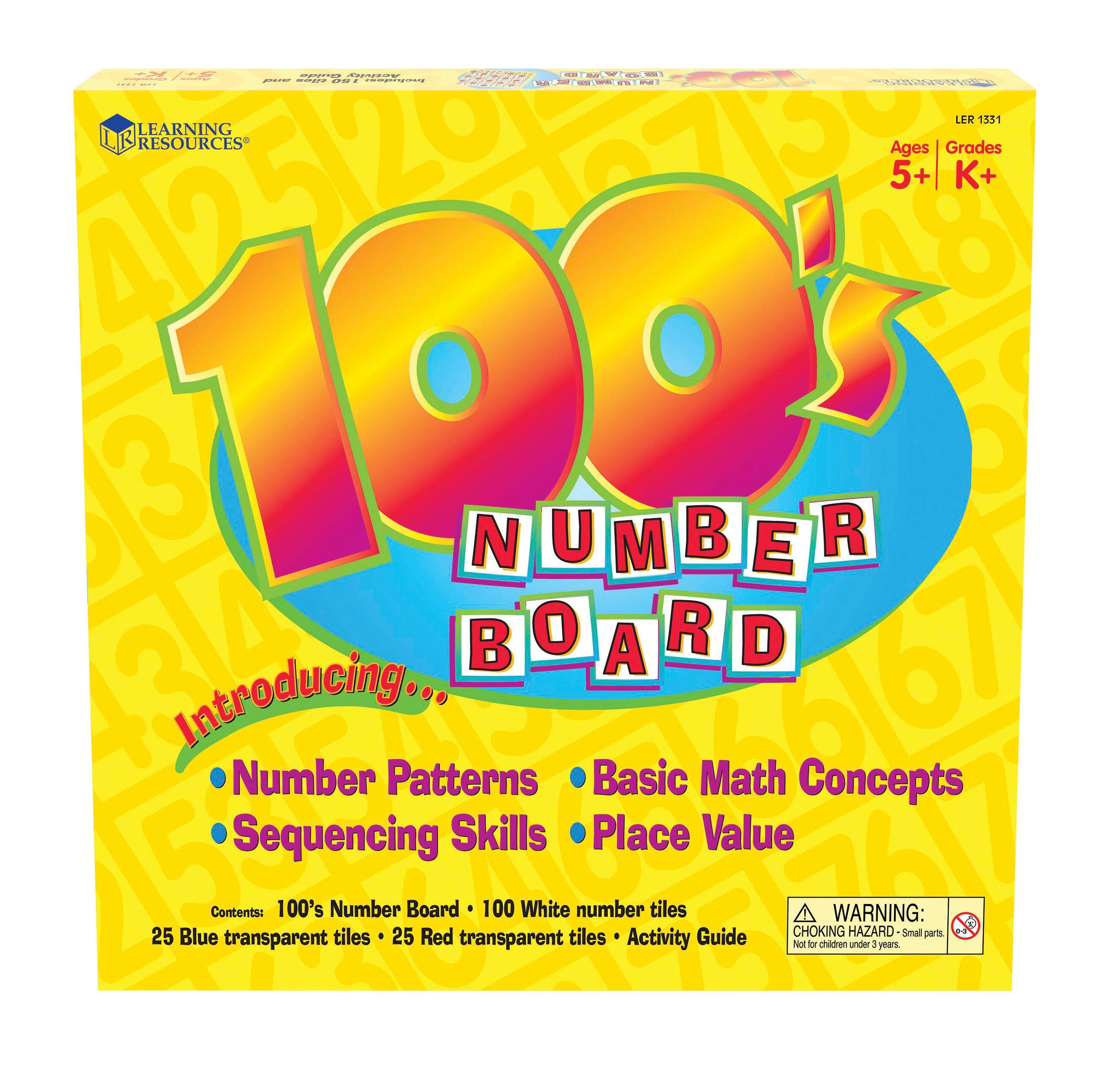 Learning Resources offers this Hundred Number Board as a hands-on resource for early math learning. The durable plastic board with recessed squares features numbers printed on the front and a plain grid for patterning and graphing activities on the reverse. Includes 100 numbered white tiles, 25 transparent red tiles, 25 transparent blue tiles, and an activity guide. The tiles measure 1 x 1 inches and the board measures 12 x 12 inches. Ages 5 and above.