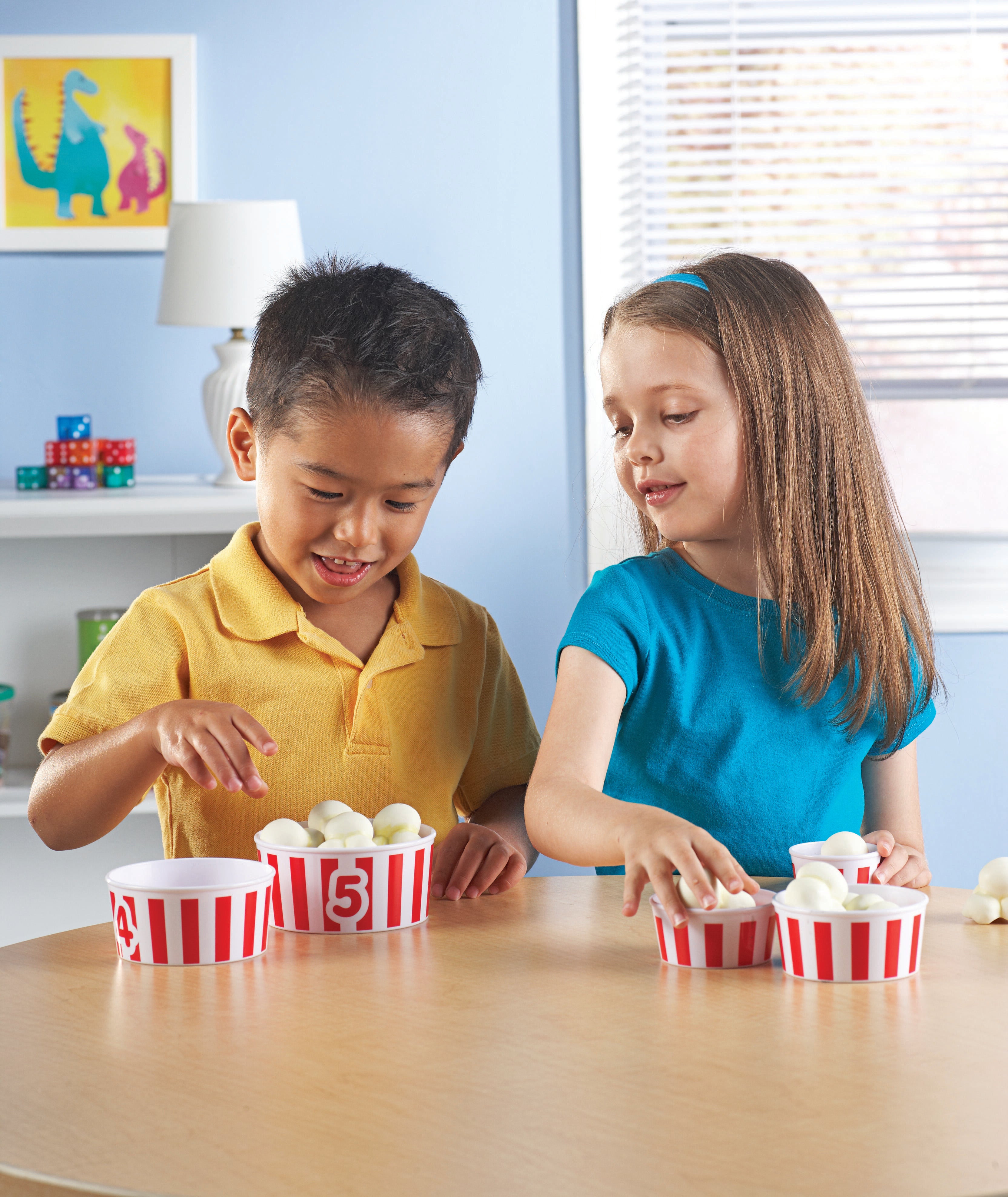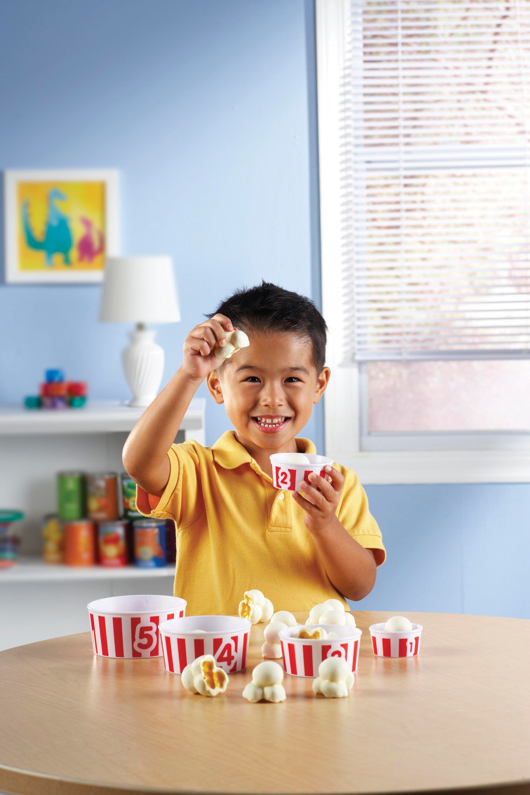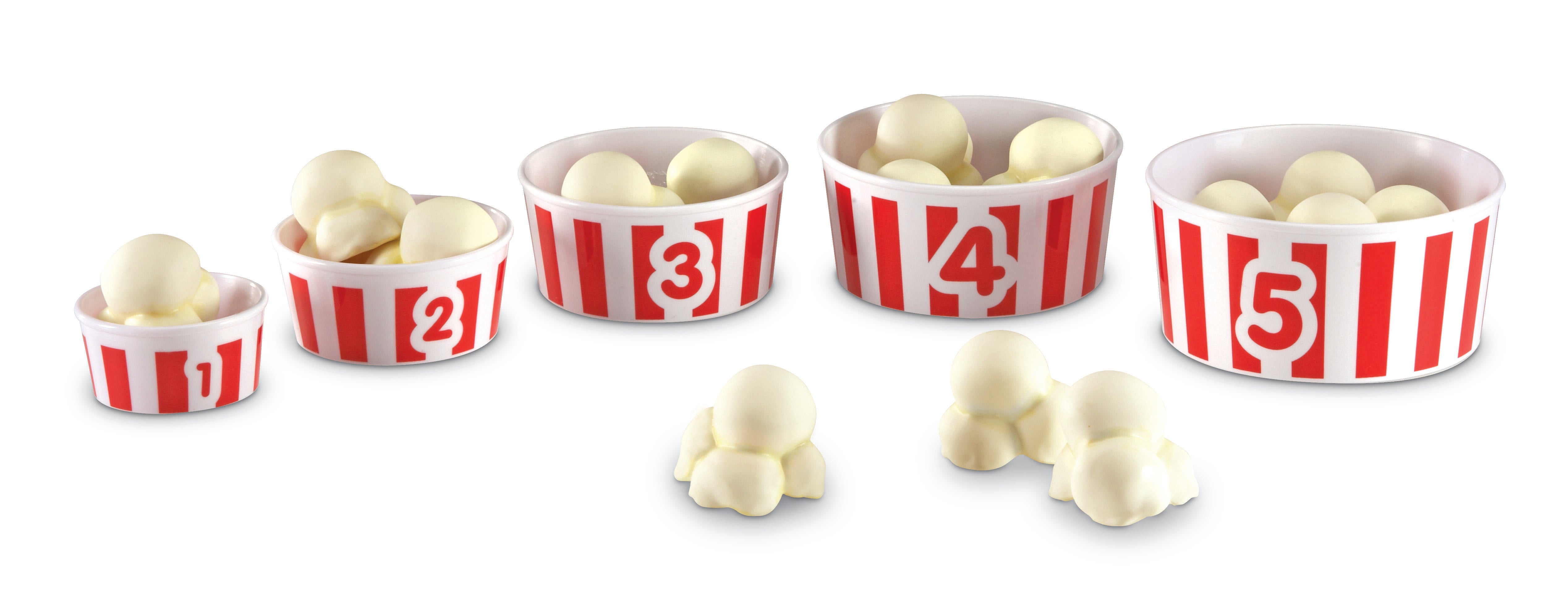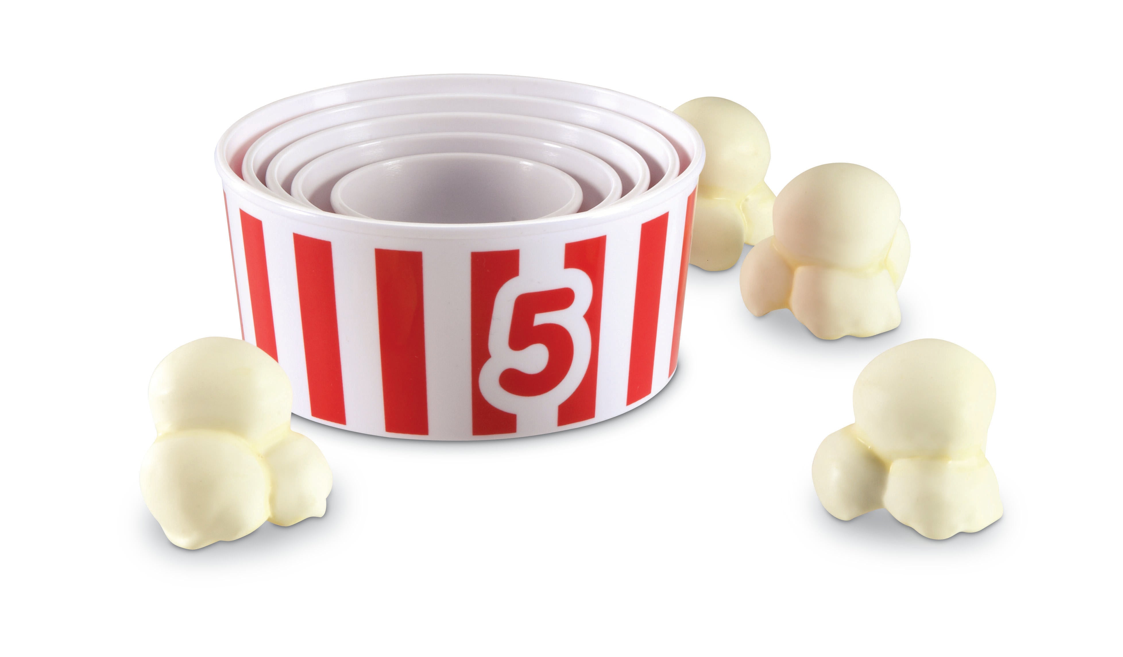 Description Learning Resources Smart Snack Count 'Em Up Popcorn uses jumbo popcorn pieces to build number recognition and practice counting sets. Pieces can be counted into five different-sized bowls printed with numbers 1 to 5. Bowls nest to store, largest measures 2-1/4 L x 4-3/4 W inch diameter. For Ages 2 and up.Features Build number sense and recognition and practice counting sets Includes 15 jumbo popcorn pieces to count into 5 different size bowls (printed with numbers 1-5) Bowls nest to store largest measures 2.25" x 4.75" in diameter Includes:
