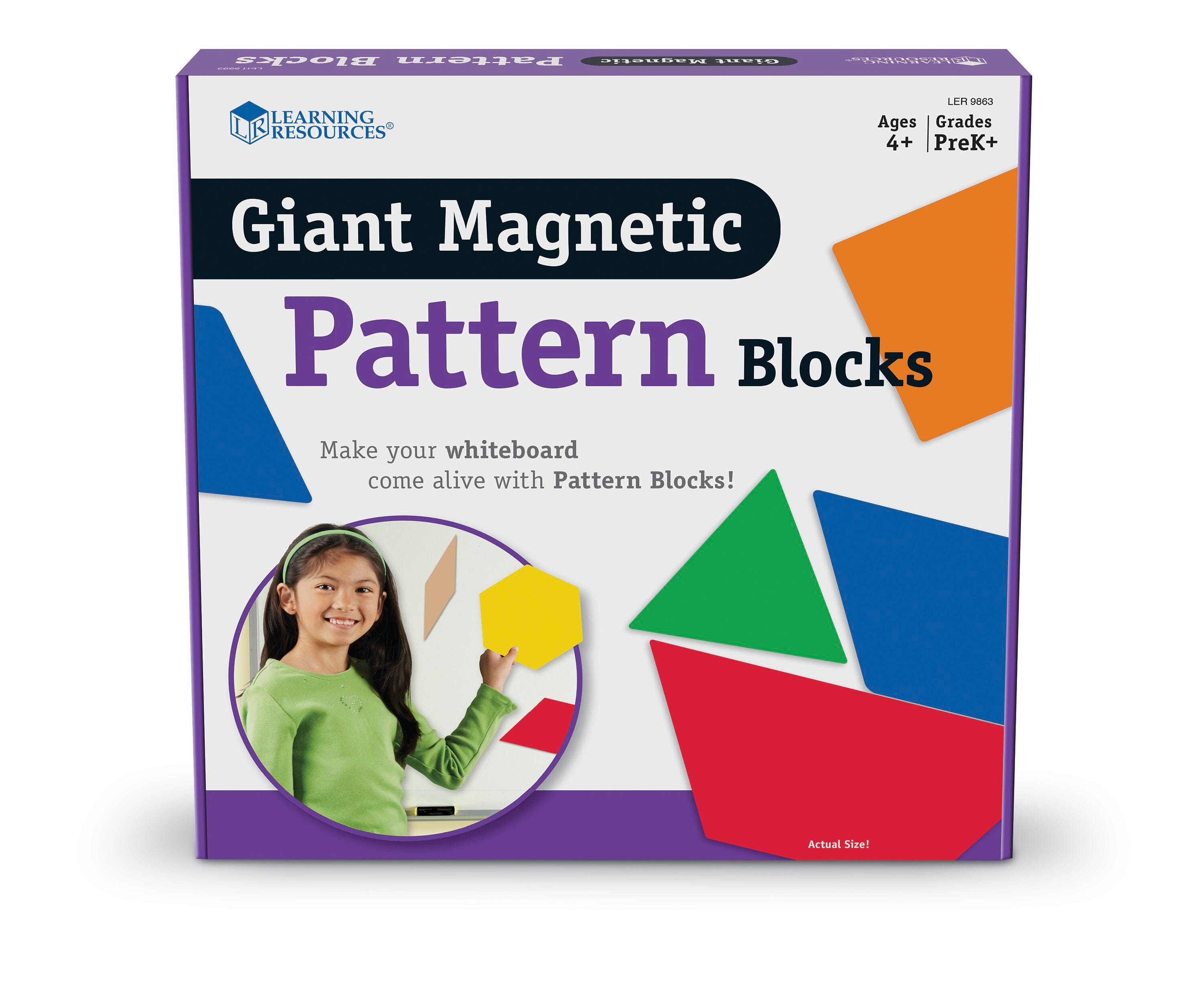 Learning Resources Magnetic Pattern Sets are perfect for demonstration, proportionately sized pieces are 3 times the length of standard pattern blocks on each side and 9 times greater in total area! Largest piece (hexagon) measures 6 inches. Includes activity guide. Ages 4 and above.