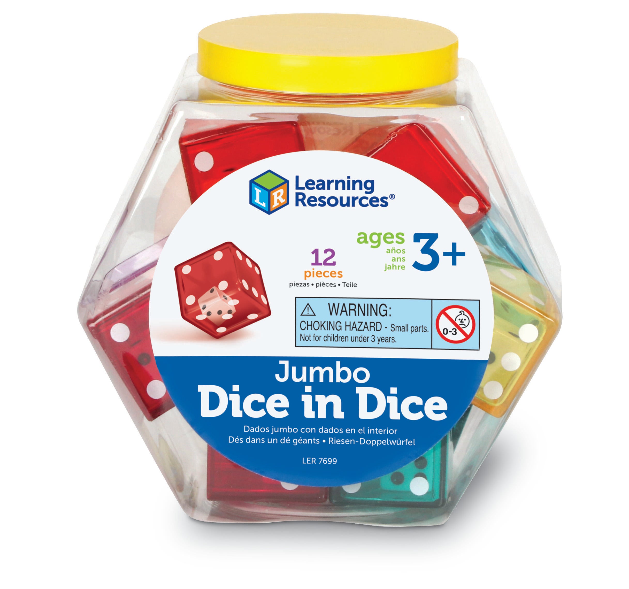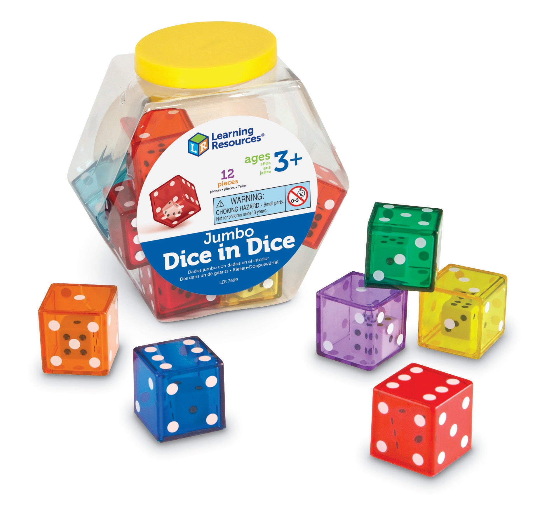Description Learning Resources Jumbo Dice In Dice is ideal for grades 1 to 4 students and helps in improving number concepts, counting, operations and probability. The high interest manipulative feature exterior cubes in red, yellow, green, light blue, orange and light purple and the cubes measures 1-1/4 inch.Features Reinforces number concepts, counting, operations and probability Generates engagement with these unique high-interest manipulatives Features colorful exterior cubes in red, yellow, green, light blue, orange and light purple Exterior cubes measure 1-1/4 inch squares