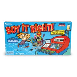 The Buy It Right Shopping game from Learning Resources has students set prices, buy and sell items, and learn the value of money as they move around the game board! Reinforce the importance of coin and bill recognition, adding, and making correct change through interactive game play. This game includes a calculator, game pieces, 40 paper play bills, and 100 plastic coins. The game board measures 19 x 19 inches. Designed for 2 to 4 players, grades 1 and up.Features