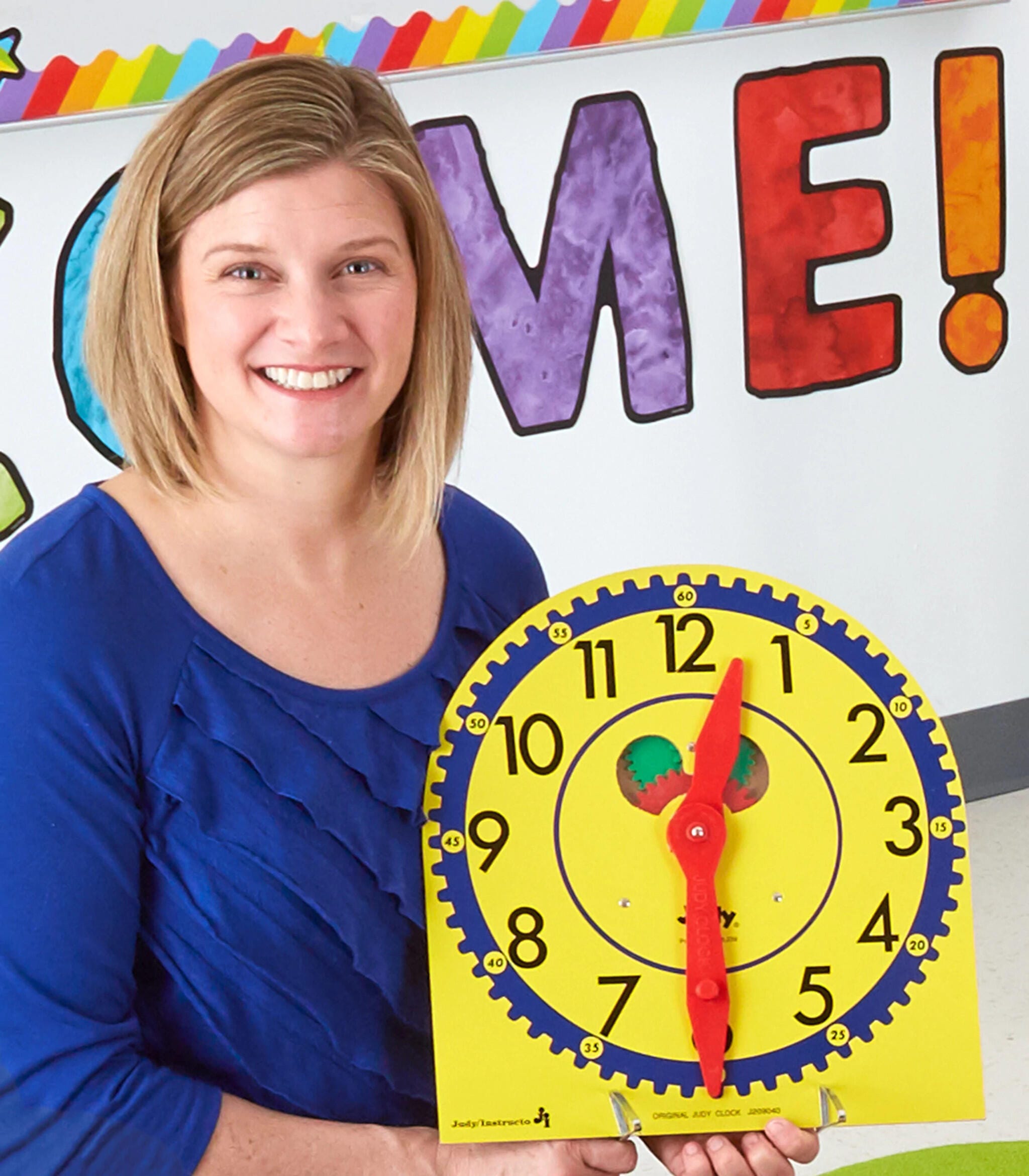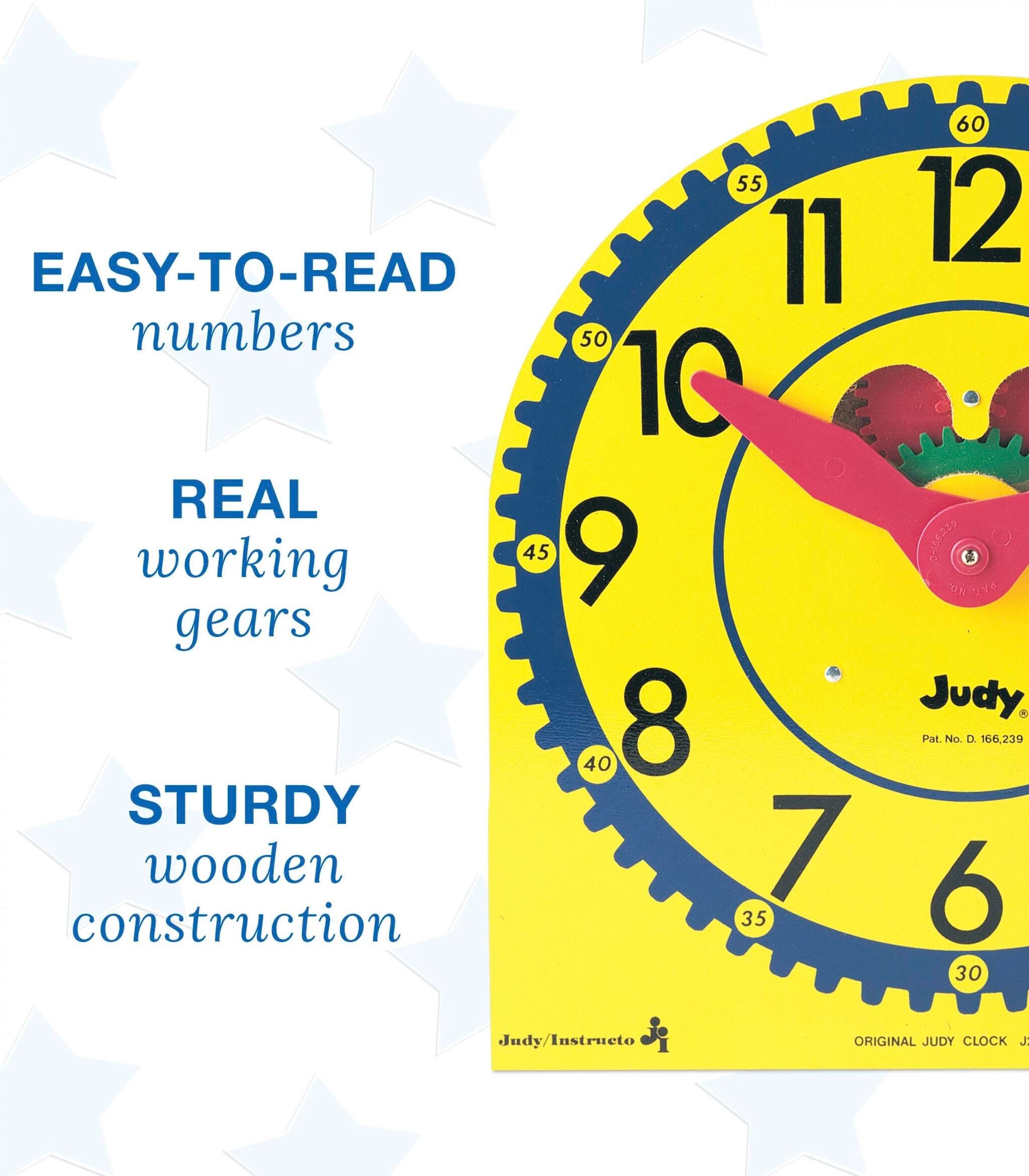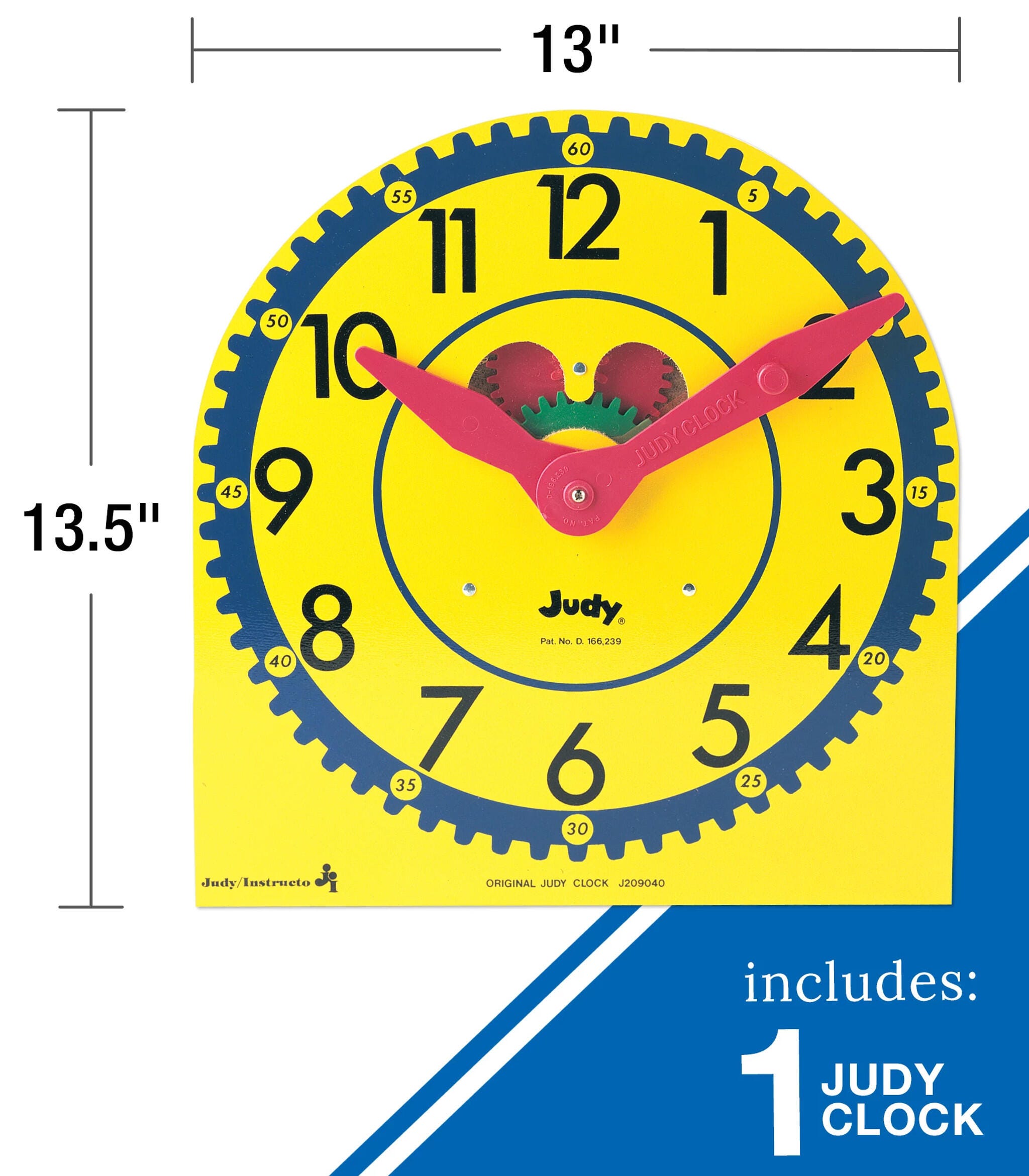 Judy Instructo Original Judy Clock for grades K to 3 measures 12-3/4 in x 13-1/2 in and features easy-to-read numerals that show elapsed time in 5 min intervals. Clock comes with visible functioning gears that maintain correct hour hand and minute hand relationships. These clocks are permanently assembled with wood and a handy metal stand.