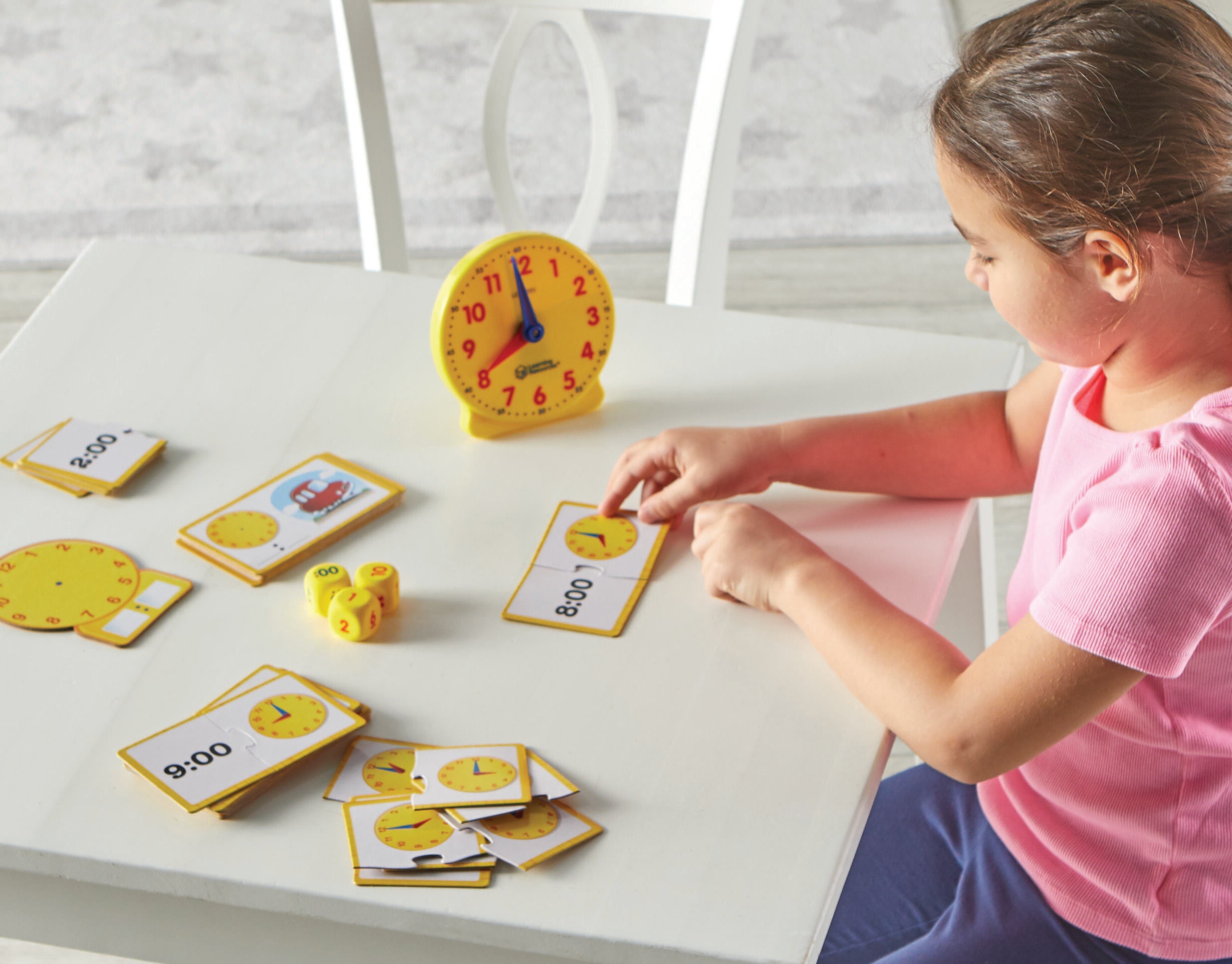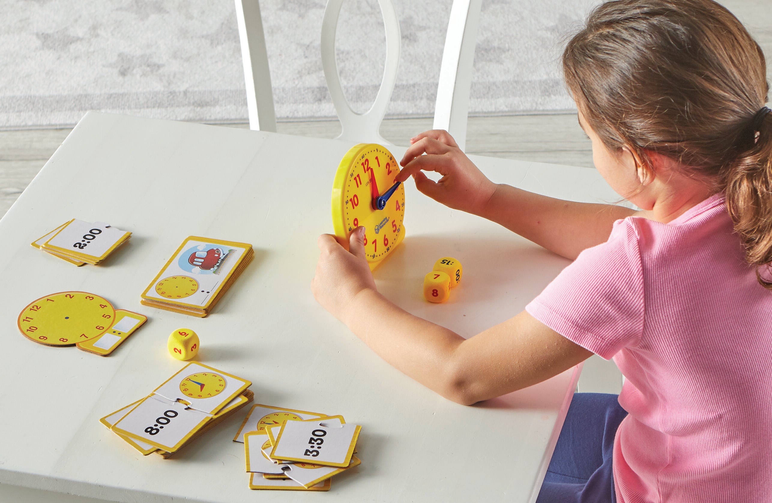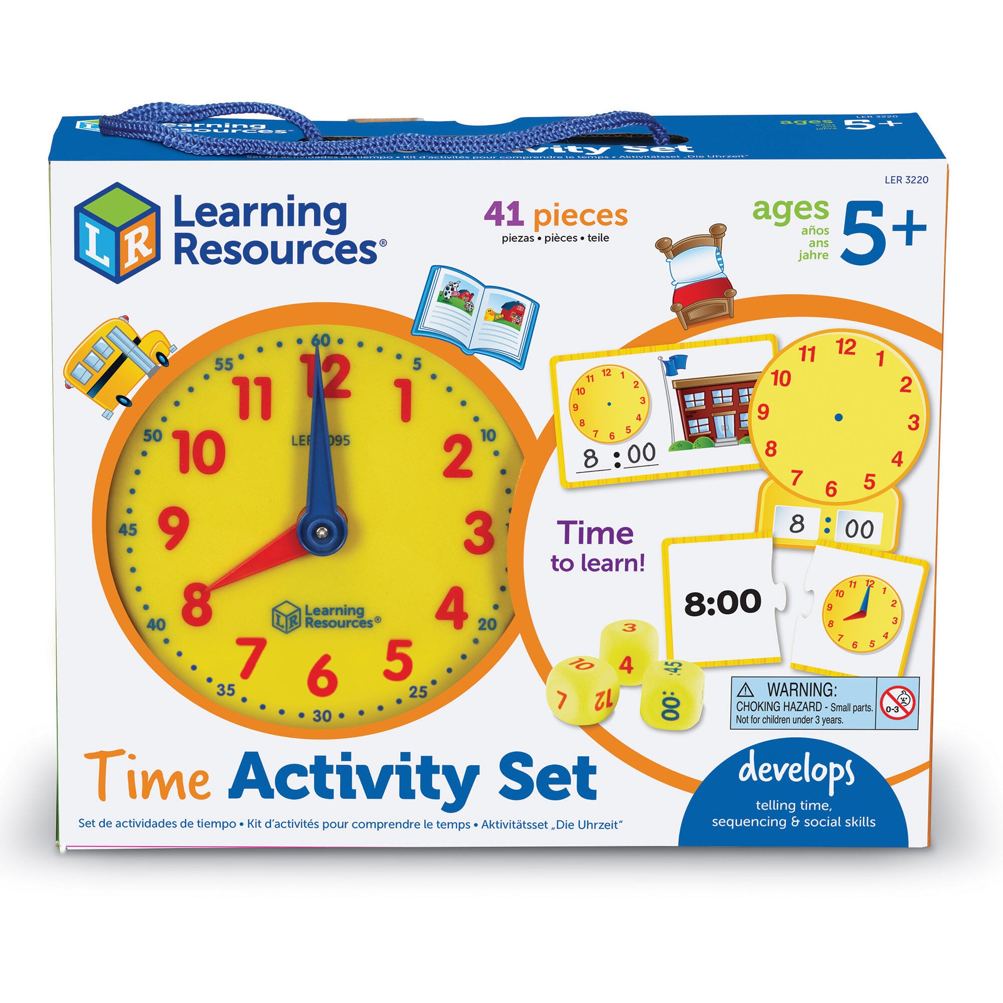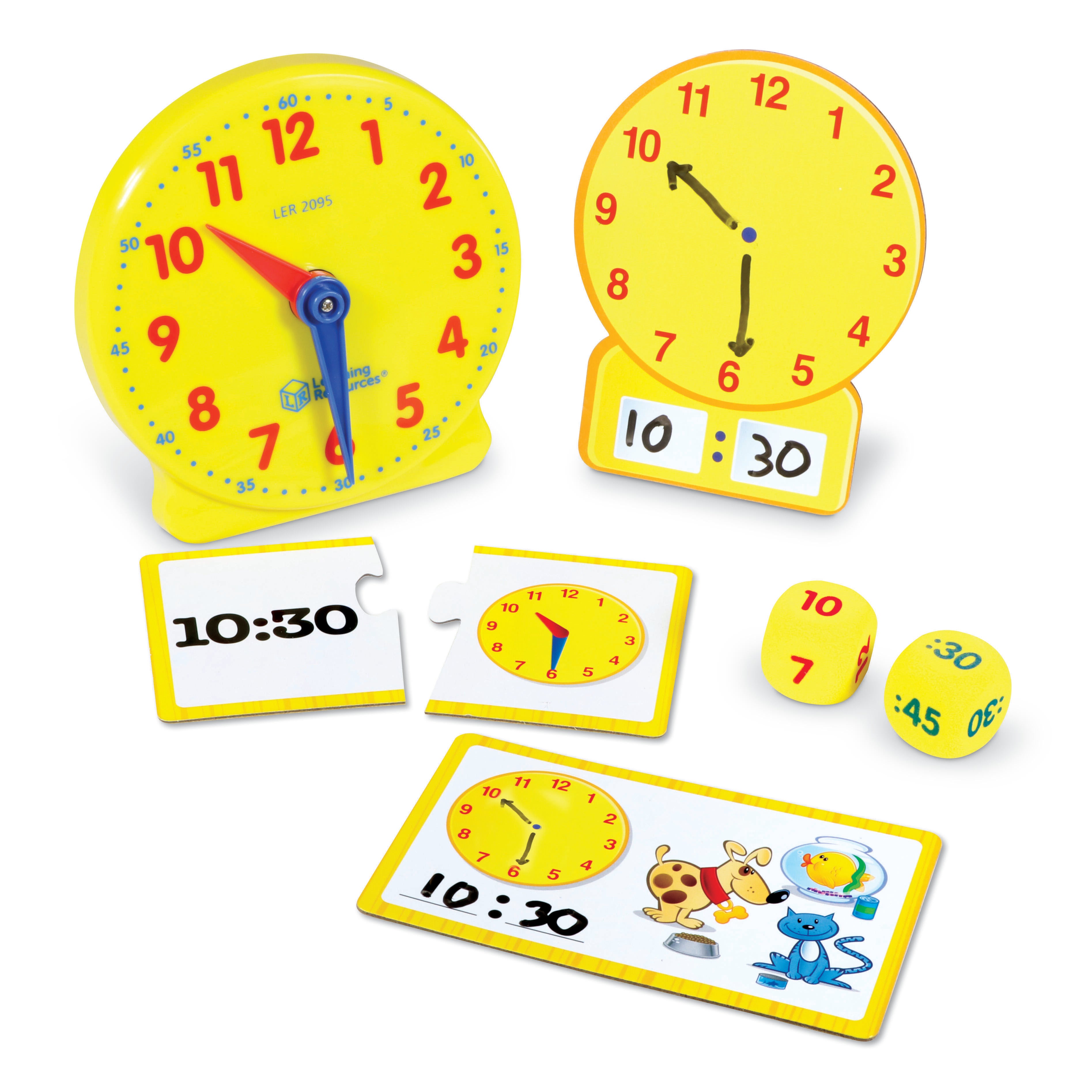 Description Master early skills with learning fun! This comprehensive Time Activity Set from Learning Resources focuses on the key area of time. It includes materials to facilitate learning how to identify hour and minute hands, tell time, write the time, and much more! This hands-on set can be used in a variety of ways to suit the learning styles of beginner to advanced students.Features Develops time-telling skills as children learn to identify the hour and minute hands, tell time in hours, half-hours, and quarter-hours, and more Encourages student engagement with hands-on learning Helps children corrilate digital and analog times Excellent addition to early childhood environments including classrooms, preschools, childcare centers, and homes Includes: 1 Plastic Clock 1 Write-On, Wipe-Off Clock 24 Double-Sided Puzzle Cards 12 Double-Sided Activity Cards 3 Time Dice Activity Guide