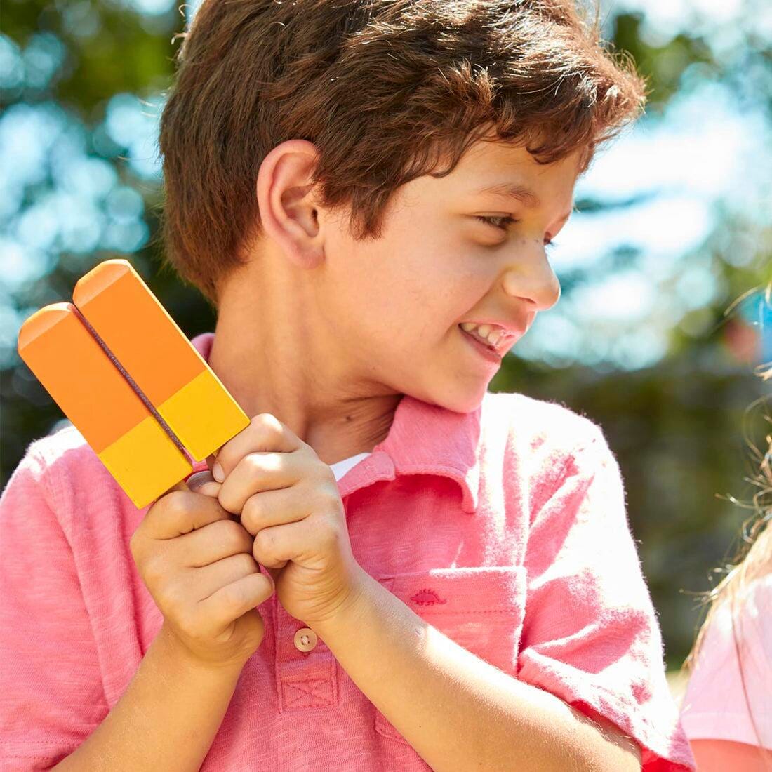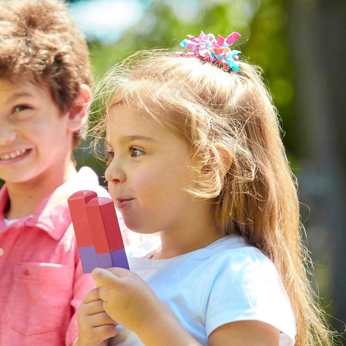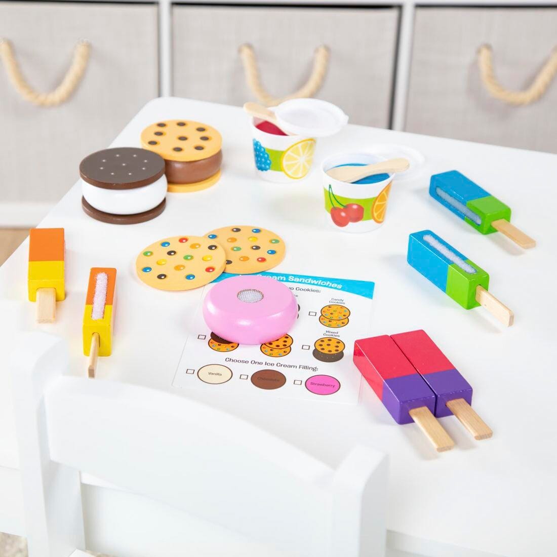 Toddlers and preschoolers can chill out with this 24-piece mix-and-match set! Make wooden ice cream sandwiches, ice pops, and Italian ice cups. Self-stick tabs hold together three different cookie flavors and vanilla, chocolate, and strawberry ice cream fillings. There are six multi-colored ice pops on sticks to stick together and pull apart. Or, fill the lidded cups with four flavors of ice and serve with a classic wooden spoon! Display the array of chilled goodies in the storage tray and use the menu card to identify all the pieces and place orders.Features