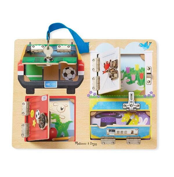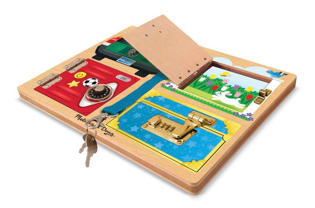 Unlock, unlatch, open the hinged panels, and count on finding fun when the pictures beneath are revealed in the Melissa & Doug Lock and Latch Board!