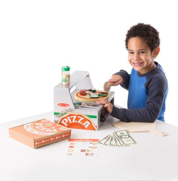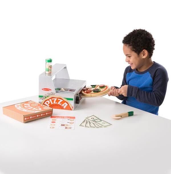 Melissa & Doug's pretend pizza can be made to order for your customers. Start with the super secret pizza sauce and cheese on the crust. Then, customize your toppings (pepperoni, olives, mushrooms, and peppers) and “bake” in the pizza oven built into the storage and serving counter. Pieces stick together with self-stick tabs and can be sliced with the rolling wooden cutter. The set comes with a grated cheese shaker, a wooden paddle, a pizza box, a reusable menu for placing orders, a guide to help with pizza prep, and play money to pay for your order!