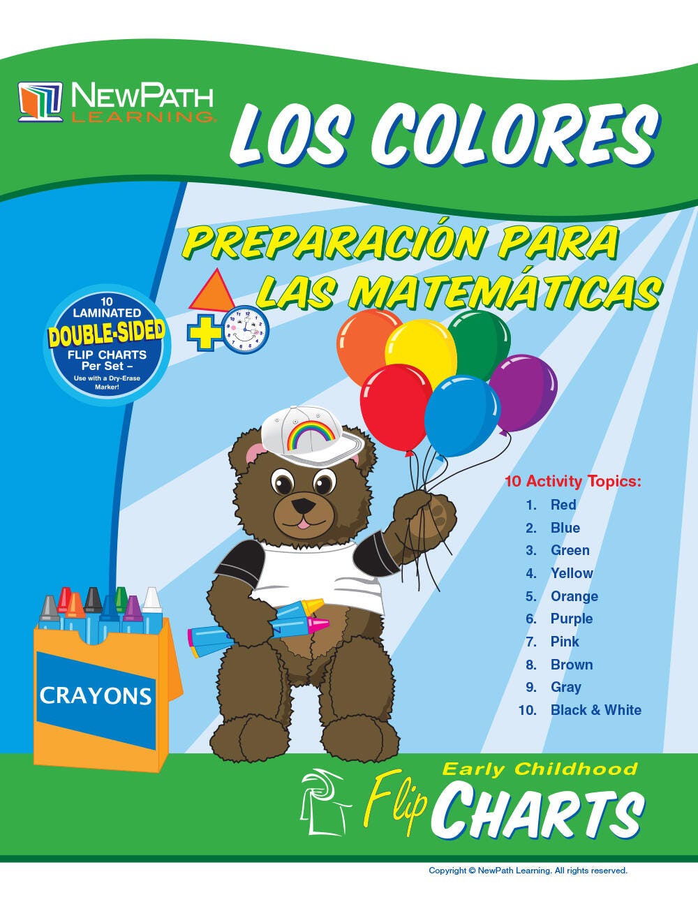 The All About Colors Spanish Language Flip Chart Set includes the following 10 double-sided, laminated charts: