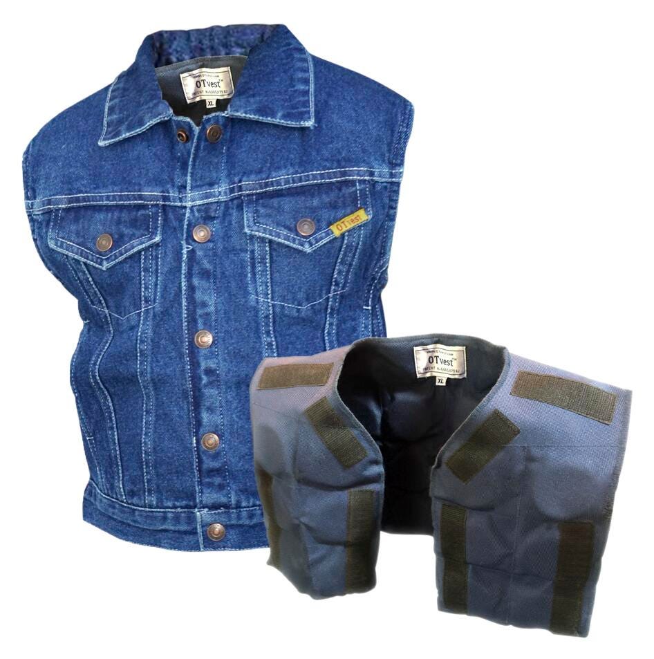 The OTvest, denim weighted vest is designed/patented by an OT, whose training in sensory and neurological function influenced the IMPORTANT weight placement in the OTvest, and whose research has been published in The American Journal of Occupational Therapy. The OTvest's weight placement is strategically positioned DIRECTLY UPON the wearer’s shoulder-girdle, requiring less weight to be uniquely effective for providing trunk stability (ataxia, cerebral palsy, dyspraxia, feeding disorders, and other movement disorders), proprioceptive input, and deep pressure for calming, focusing and behavior organization. "It Feels Good!" Weights are calibrated to the size of the wearer and placed so that weights can't fall out, get lost or played with, and there is no need to guess the weight amount needed to be effective. The denim vest comes with two stylish front pockets, two side pockets and five or six front snaps. The large vest is intended for users that weigh 110 to 165 pounds. The vest measures 42 inches at the chest, and neck to waistline measurement is 23 inches. Includes 4 pounds of weight. The weight can be removed, allowing the vest to be machine-washed.