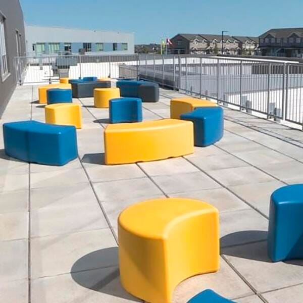 Swerve is a arc shape bench that can be used in modular arrangements with the Tenjam's Dash (straight shape) bench to create many seating arrangements. Use Swerve by itself or pair it with more Dash and Swerve Benches to provide continuous seating. One-piece hard plastic design provides the ultimate in tamper resistance and easy cleaning and disinfecting. Supports over 750 pounds. Non-marking rubber legs protect your indoor and outdoor floor surfaces and provide excellent grip on any flooring surface. Engineered for year round outdoor use and exposure to sun, snow, sand, salt, and rain. The top of the bench is slightly crowned to promote the shedding of water, quick drying, and immediate use after it becomes wet.
