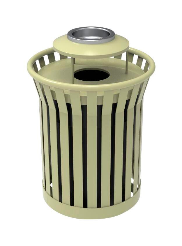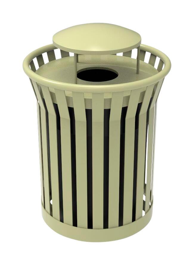 Description This attractive Jackson Series 36-gallon Trash Receptacle is built to meet the needs of your outdoor space. This bin is constructed with 1/8 x 2 inch steel flat bars on an MIG welded frame for ultimate support and durability. This bin can be portable and/or surface mounted, depending on the needs of your space. Available in several lid types such as ash urn, rain bonnet, or classic flat top, as well as a variety of powder-coat finishes to match the aesthetic of your space. Lid and liner are included.Features Constructed with 1-1/2 inch thick cast aluminum frame and all stainless steel hardware for long-lasting durability Can be portable or surface mounted depending on the needs of your space Several powder-coated finish options as well as lid types for ultimate customization Five year warranty included