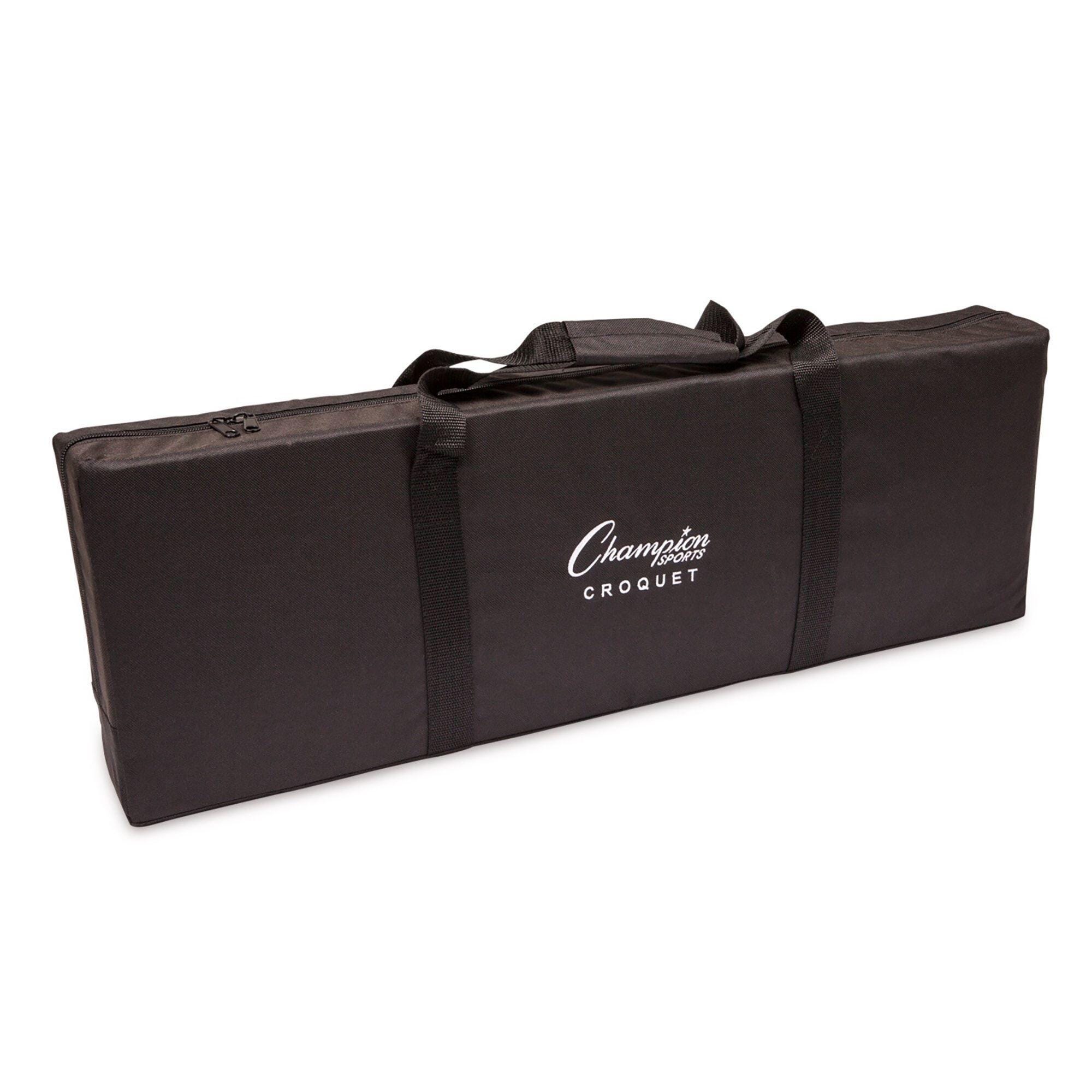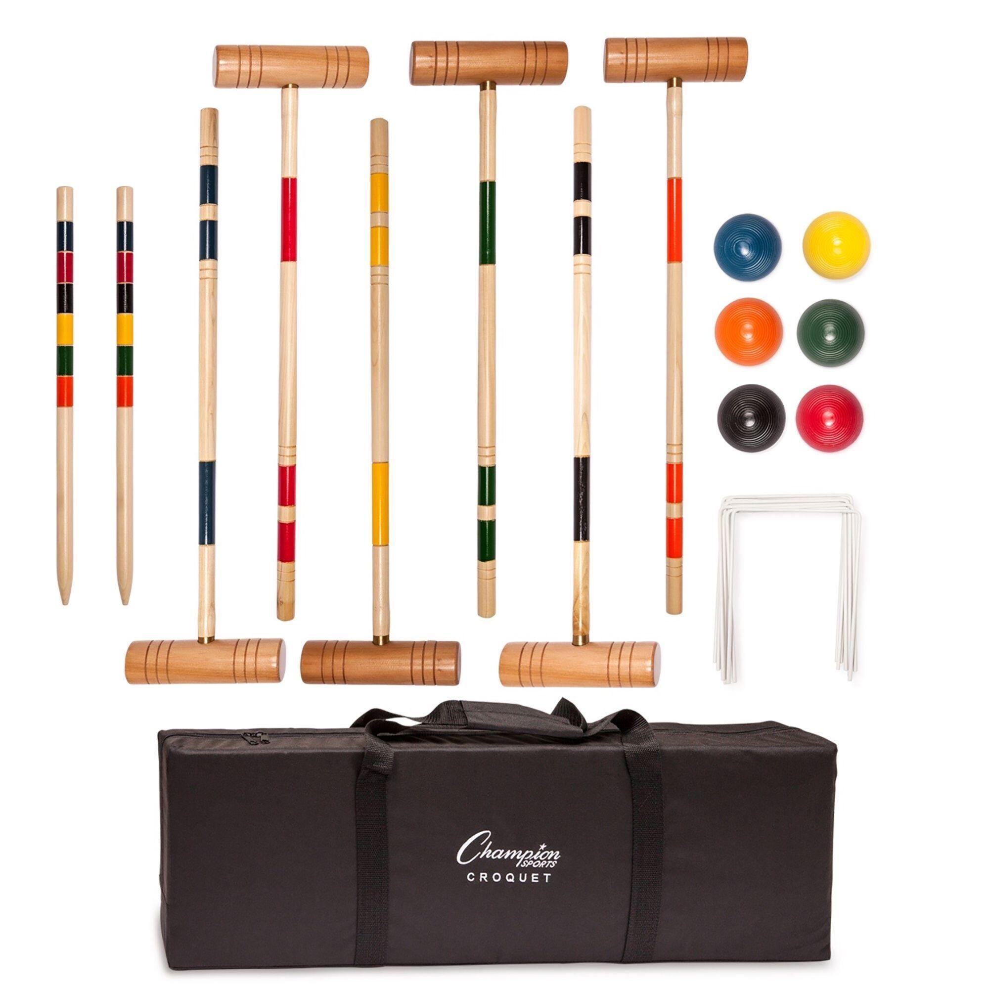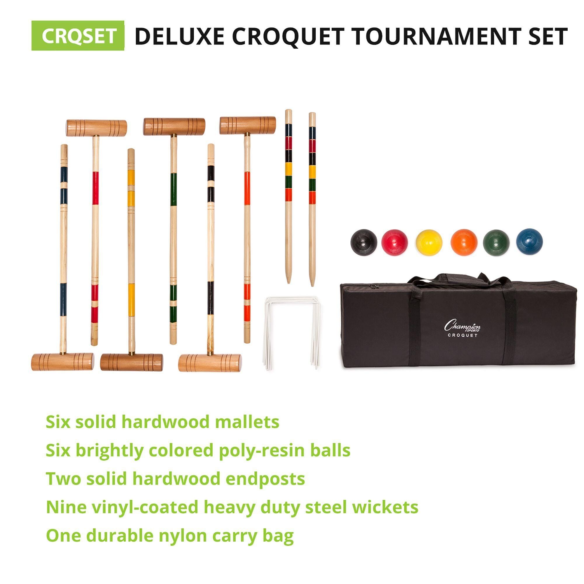 Description Hold your own croquet competition at the park, club or out on the schoolyard with this Champion Sports Deluxe Tournament Set. The set features durable, brightly colored, easy-to-spot balls and heavy-duty steel wickets that will hold up game after game. The hardwood mallets have a comfortable shape and feature a new and improved handle connector to keep them in peak condition longer. Designed for players of all skill levels, this croquet set includes a complete set of rules and an incredibly durable nylon carry bag.Features Portable set makes it easy to play croquet anywhere Great way to improve hand-eye coordination Improved handle connector ensures mallets are easy to assemble and withstand regular play Durable wood, steel, and poly-resin materials promise long-lasting use Convenient carry bag allows for easy storage and transport Includes: 6 Hardwood Mallets 6 Balls 2 End posts 9 Wickets Boundary Lines 1 Nylon Carry Bag