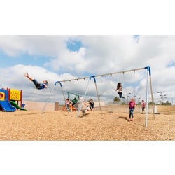 Support the staple childhood memories of swinging on the playground with this Bipod Double Bay Swing. These structures are specially designed to meet the needs of children ages 5-12 years. Comes with 4 strap seats.
