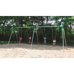 Swing into fun with this Bipod Double Bay Swing from UltraPlay. Its durable galvanized frame features an 8-foot-high bay frame to accommodate the highest of swings, with 2-3/8 inch galvanized pipe top rail and 2-3/8 inch diameter legs to support scaling high. Its powder-coated green yoke connectors are weather-resistant and provide rust protection. Comes with 4 strap seats. Factory-closed S-hooks are included with swing sets. A classic addition to your outdoor playground equipment, with some assembly required.