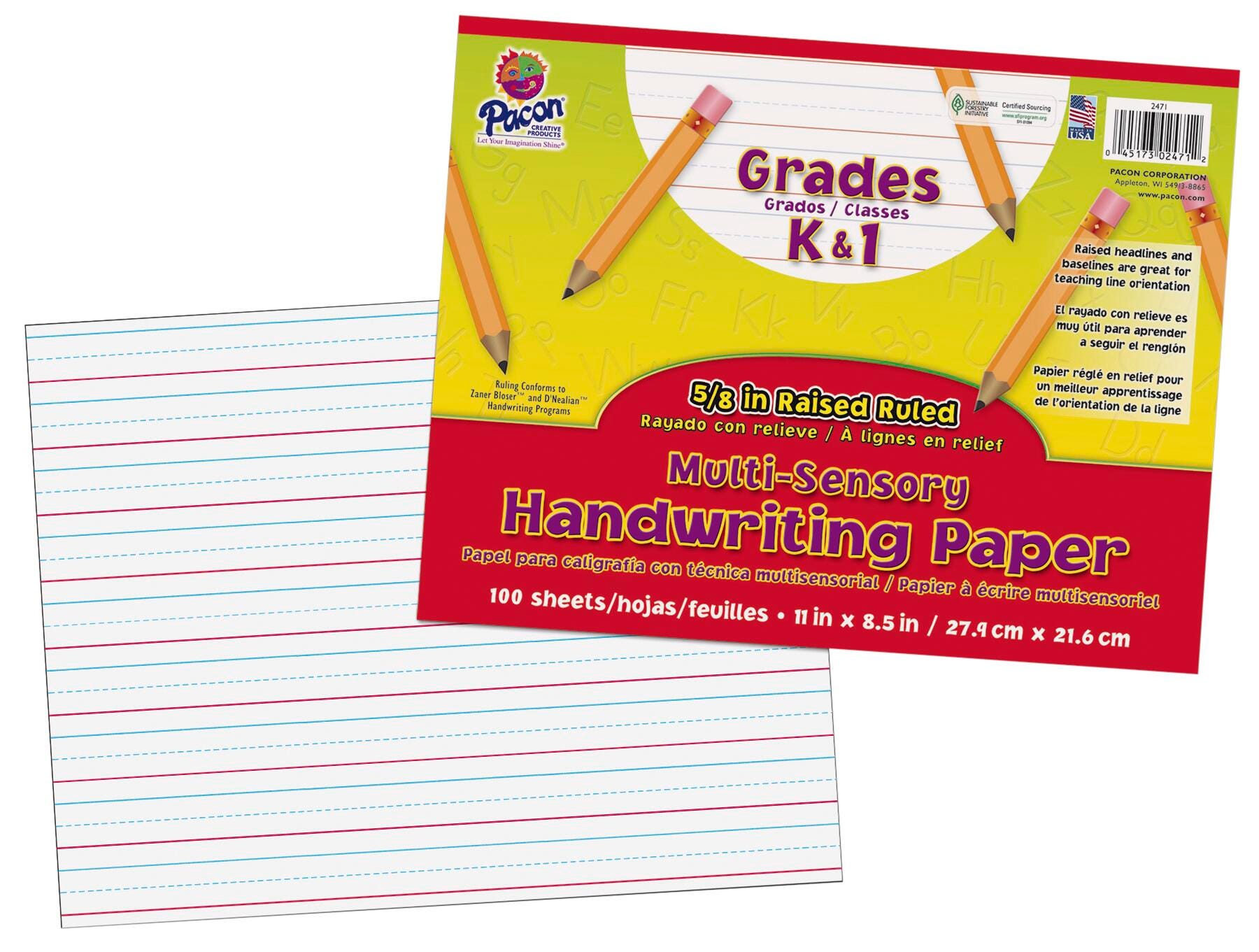 Teach handwriting using sight and touch. Pacon Multi-Sensory Handwriting Paper measures 8-1/2 x 11 inches and features raised headlines in blue and baselines in red, helping students to stay within the guidelines. This 5/8 inch ruled paper has a 5/16 inch dotted midline and a 5/16 inch skip space. Sold as 100 per pack.