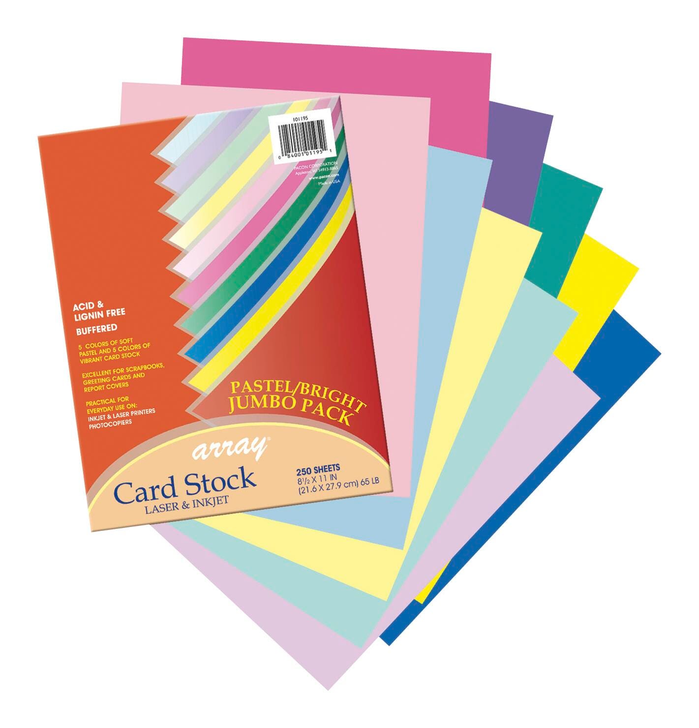 Array Card Stock is perfect for greeting cards, postcards, report covers, rubber stamping, memory books, flyers, announcements and more. This acid-free card stock comes in 250 sheet pack. Basis paper weight is 65 lbs. Colors included are Pink, Blue, Canary, Green, Lilac, Hot Pink, Violet, Turquoise, Lemon Yellow and Marine Blue.
