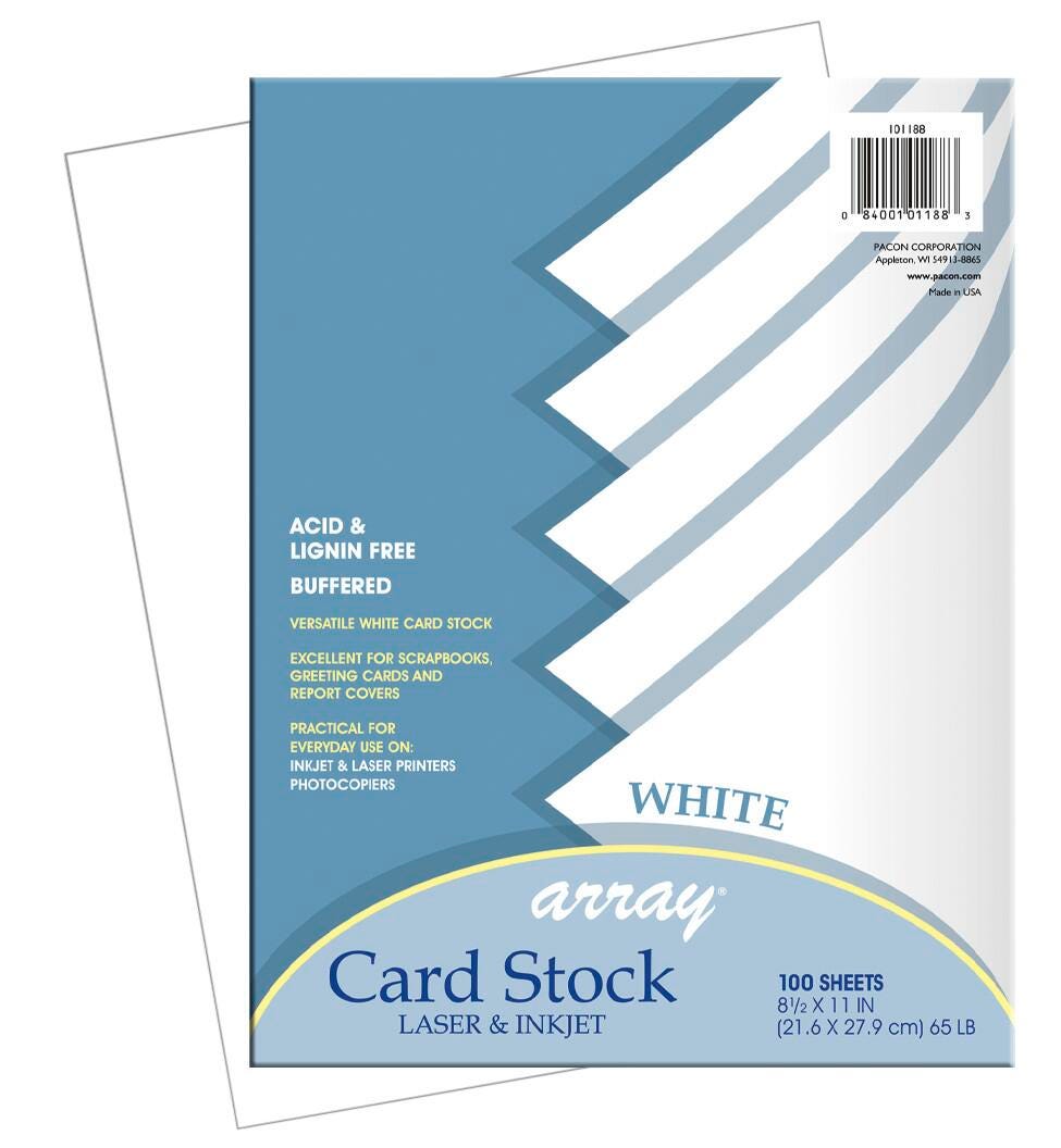 Array Card Stock is perfect for greeting cards, postcards, report covers, rubber stamping, memory books, flyers, announcements and more. This acid-free card stock comes in 100 sheet pack. Basis paper weight is 65 lbs.