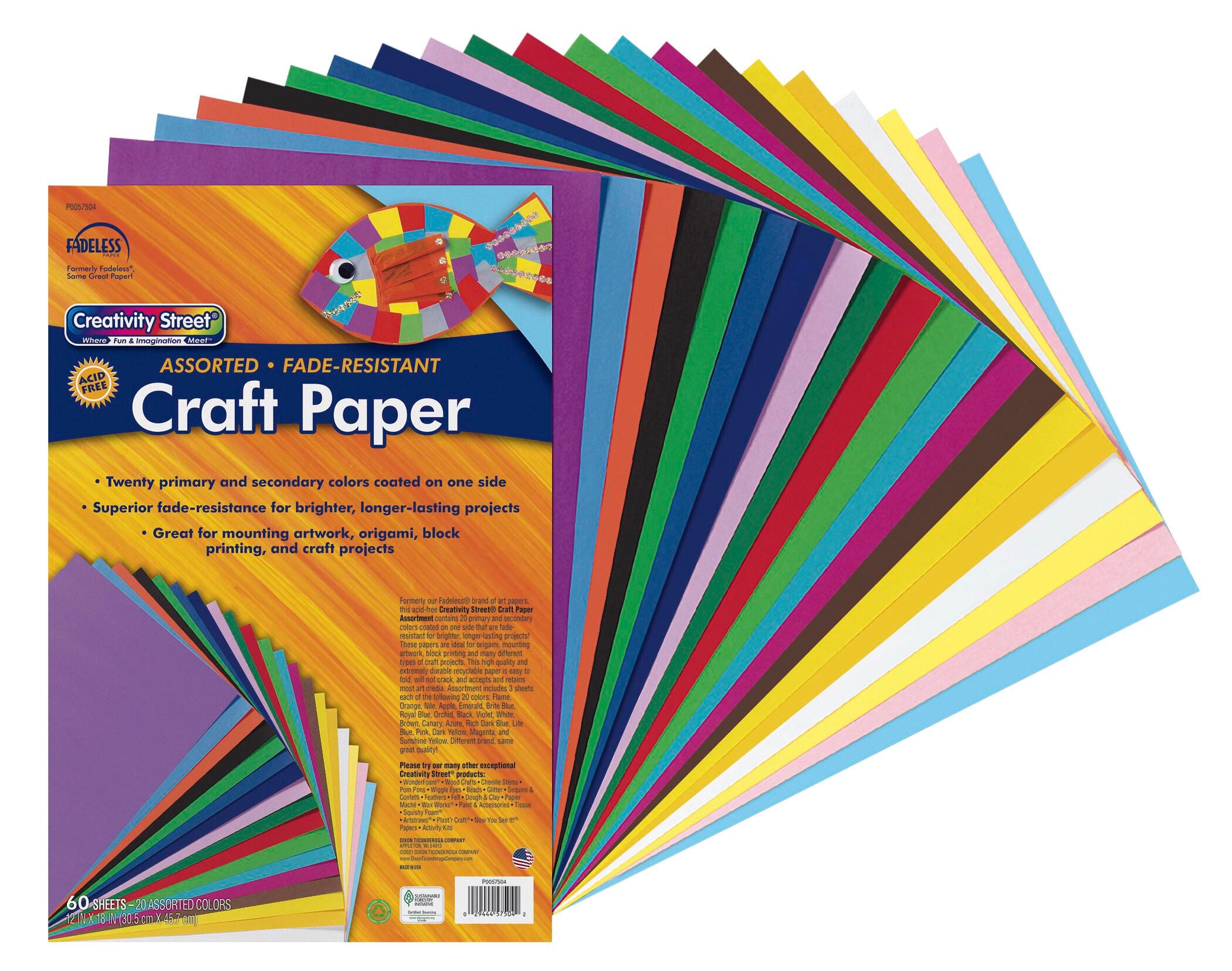 Paper assortment features 20 fade resistant primary and secondary colors. Sheets are ink-coated on one side, and appropriate for many art projects. Sulphite paper is acid-free and recyclable.