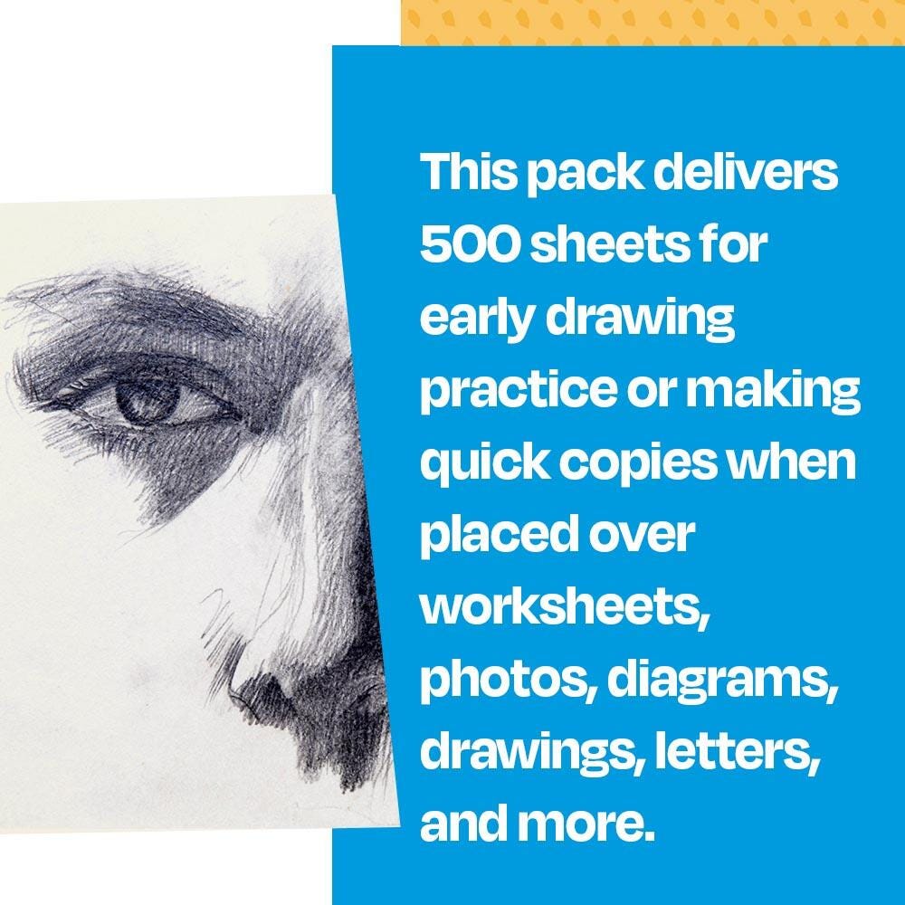 Quality, highly transparent sketching/tracing sheets are a must-have for any artist or planner. This Sketch and Trace paper from Sax is ideal for tracing images, sketching, preliminary drawings, overlays, and more. The durable 25-lb surface responds beautifully to pencil, ink, charcoal, chalk, and felt-tip markers. Simply place tracing paper over a picture (which should be easily visible through the semi-transparent tracing paper) to emulate exact lines and edges with your preferred drawing instrument. This versatile paper also works well for copying down words and notes to provide a "carbon copy" for yourself or someone else. This ream contains 500 sheets measuring 12 x 18 inches.