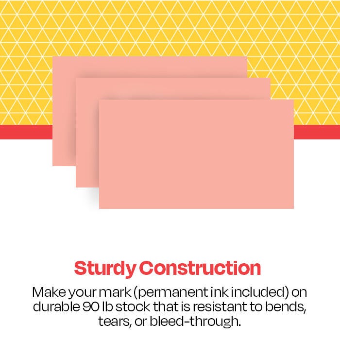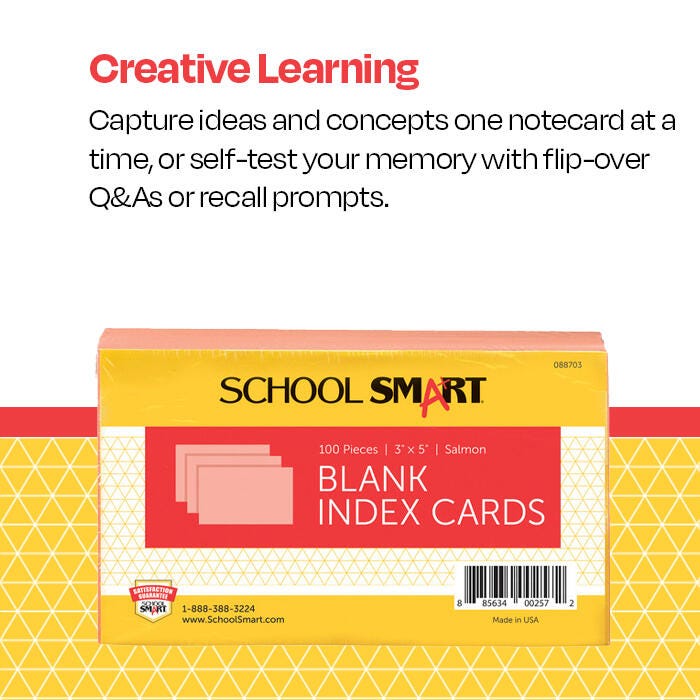 Description Tests are hard. Presentations are stressful. School Smart index cards are an easy way to work toward that "A", and present your best with minimal stress. Cards are made from 90 lb. index stock. Great for creating flashcards to help with memorization and jotting down notes for your next big speech. Salmon index cards measuring 3 x 5 inches are easy to take with you on the go! Sold as a pack of 100 index cards.Features Heavy card stock for durability and longevity Blank space on both sides leaves room for both text and images Ideal for making flashcards Great for study guides and for speech notes Perfect for capturing ideas and to-do lists on the run