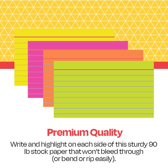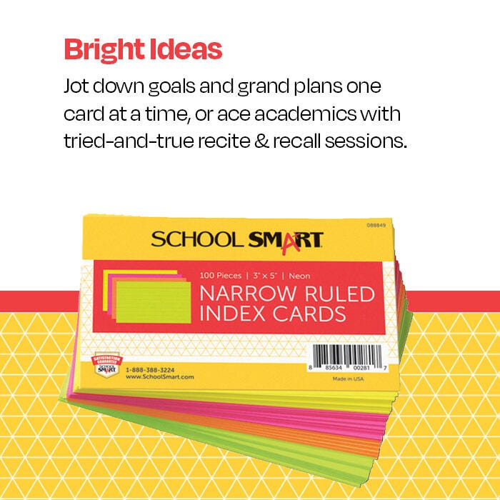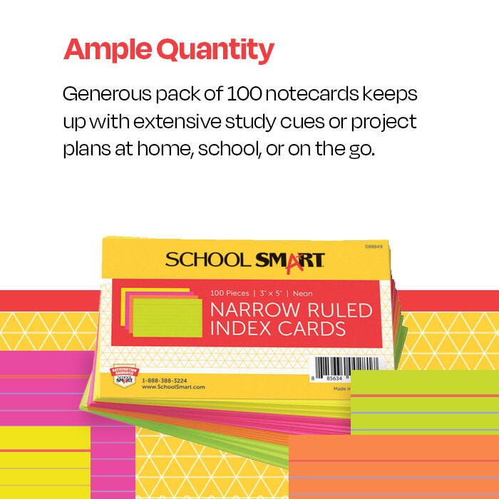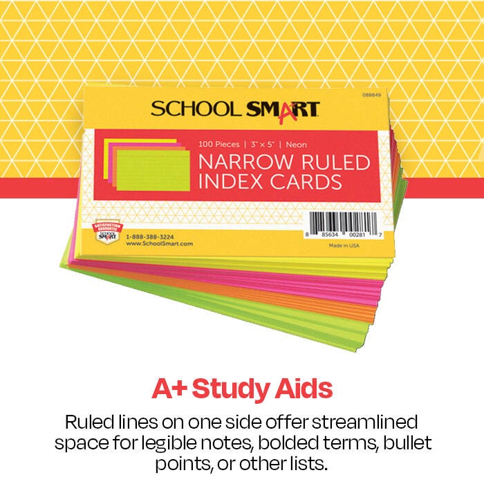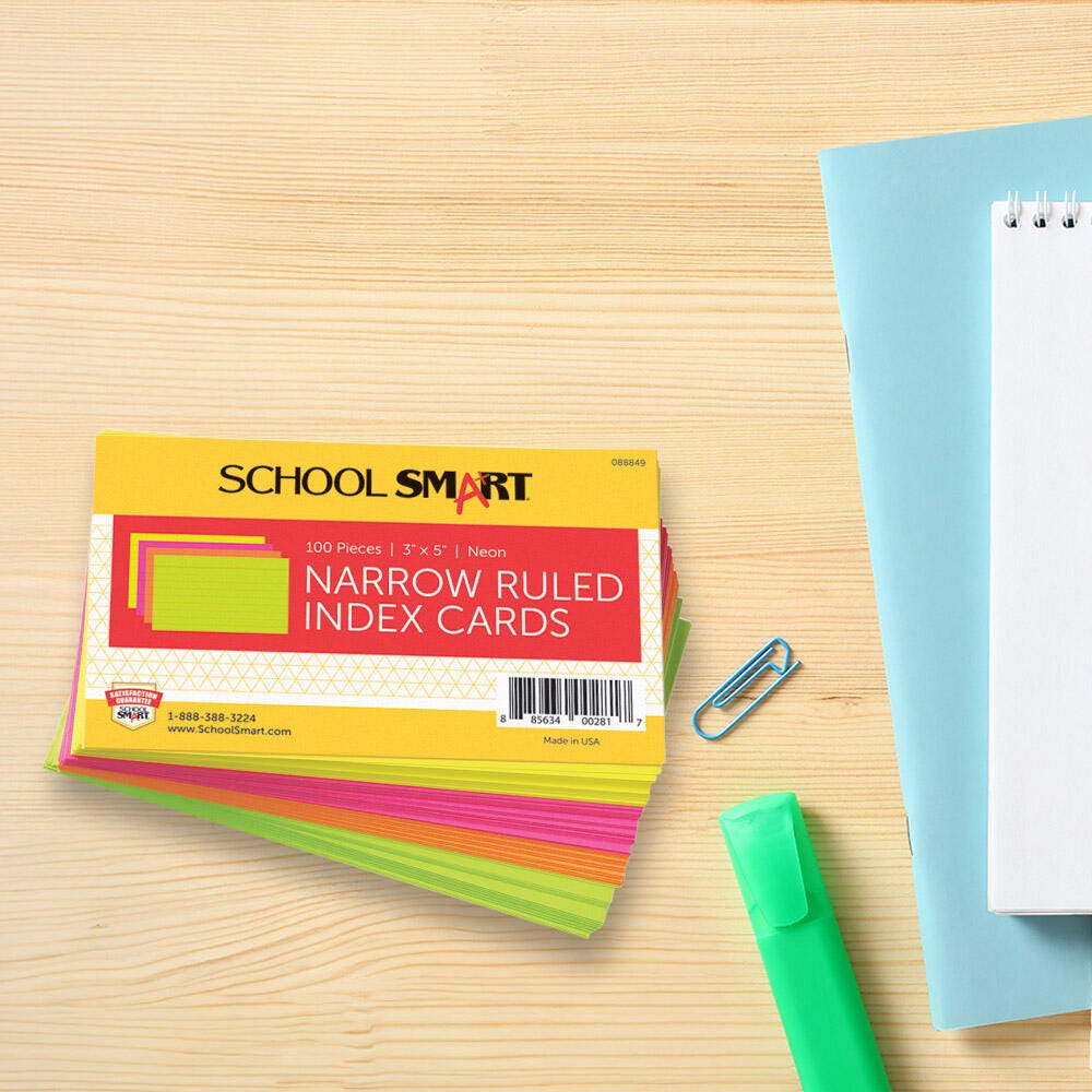 Description Add bold brightness to your study routine with ruled neon notecards from School Smart. Made from 90 lb. index stock, these convenient cards are an absolute home, school and work desk necessity. Create flashcards to help with memorization and learning, or use to jot down notes for your next speech. With a small profile of 3 x 5 inches, take these index cards anywhere for maximum productivity! Sold as a pack of 100 index cards.