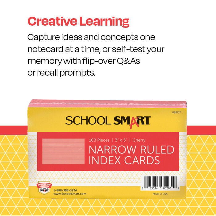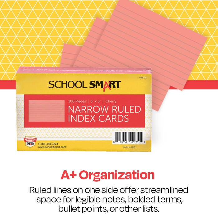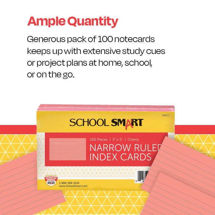 Description Add bold brightness to your study routine with ruled cherry red note cards from School Smart. Made from 91 lb. index stock, these convenient cards are an absolute home, school, and work desk necessity. Create flashcards to help with memorization and learning, or use them for note-taking to jot down key points for your next speech. Card measuring 3 x 5 inches, an ideal size for notes on the go! Sold as a pack of 100 index cards.