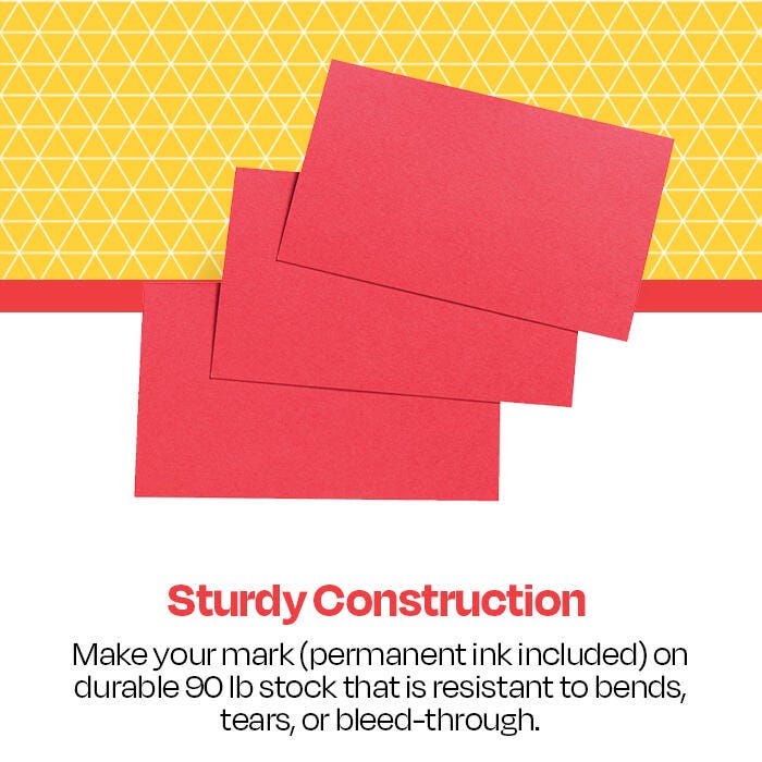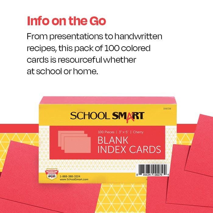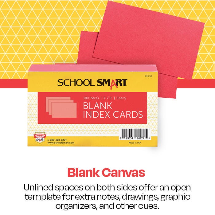 Description Add bold brightness to your study routine with cherry red note cards from School Smart. Made from 90 lb. index stock, these convenient cards are an absolute home, school and work desk necessity. Create flashcards to help with memorization and learning, or use to jot down notes for your next speech. Card measuring 3 x 5 inches, an ideal size for notes on the go! Sold as a pack of 100 index cards.Features Built to last with durable index stock construction Blank space on both sides leaves room for both text and images Ideal for making flashcards Great for notes in public speaking Perfect for capturing ideas and to-do lists on the run