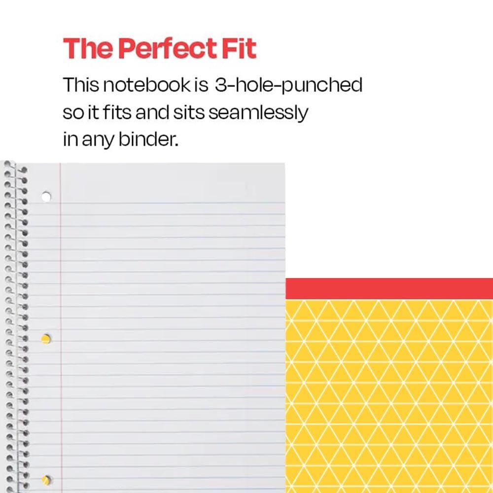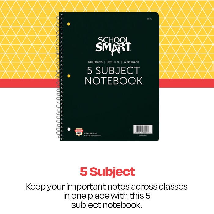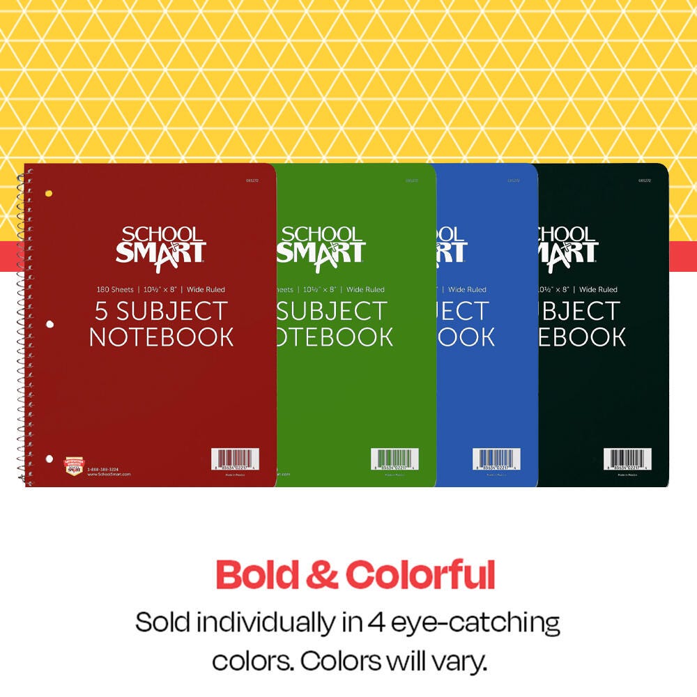 The School Smart spiral wide ruled notebook features sturdy sulphite bond paper with ruled margins, 15 lb thickness, and 3/8 inch wide-ruled lines. Kids and teachers love the classic five-subject notebook for practicing penmanship, writing notes, and completing essays in the classroom. The five-subject wide ruled spiral notebook is also 3-hole punched for easy storage with 180 sheets/360 pages per book. The color of these notebooks varies and cannot be predetermined.