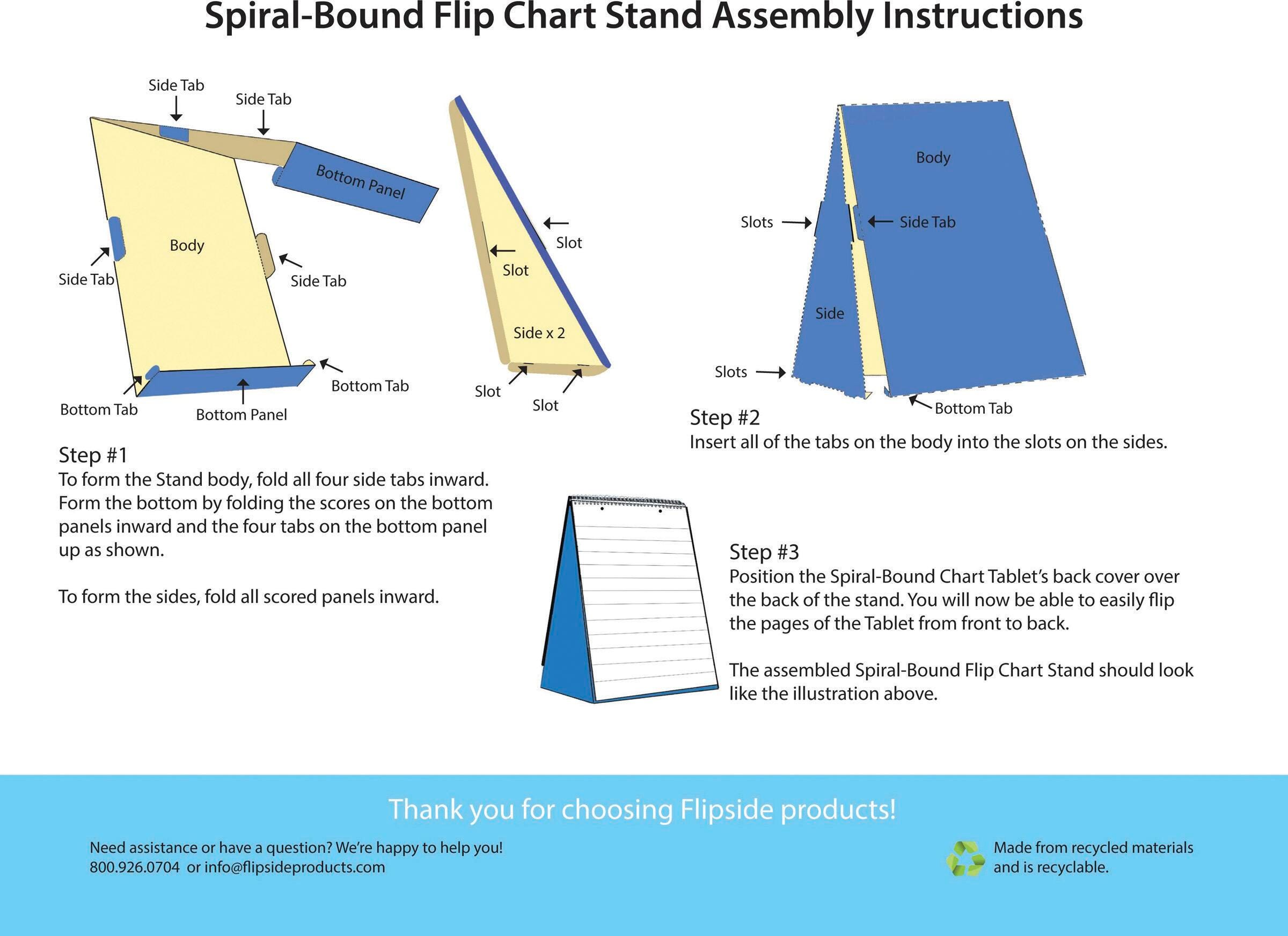 Flipside wirebound flip chart stand with dry erase and tablet set comes with instructions for easy assembly and features lightweight design that offers easy portability. Corrugated stand holds 24 x 32 inch and 24 x 16 inch wirebound chart tablets. It keeps charts visible and in good condition and adds the benefit of an attached dry erase board. It includes one stand and one 24 x 32 inch ruled chart tablet.