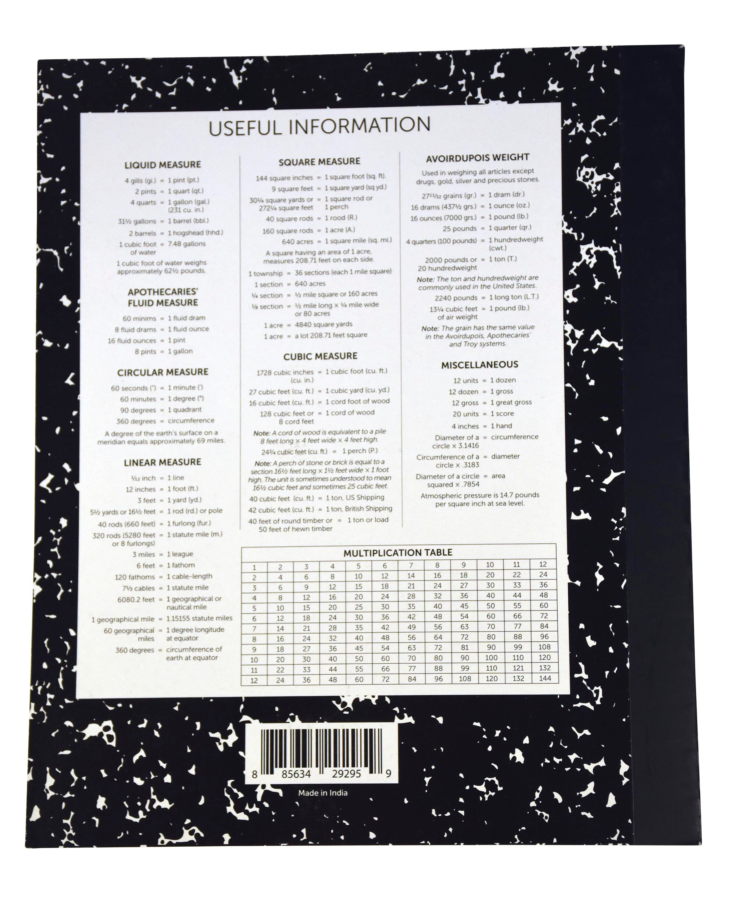 Description Marble Back Composition Book features popular black marble pattern covers that are taped and sewn to 15 lb white sulphite paper. There are 40 leaves 80 pages with 3/8 inch wide ruling and red margin lines. Includes weights and measurement information printed on the back cover.
