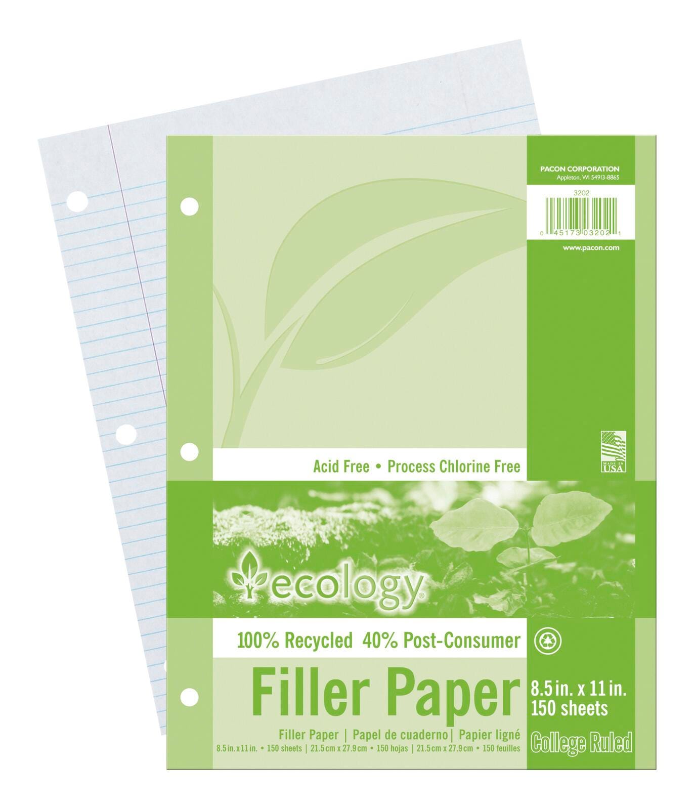 Ecology Recycled Filler Paper, 8-1/2 x 11 Inches, College Ruled, 150 Sheets