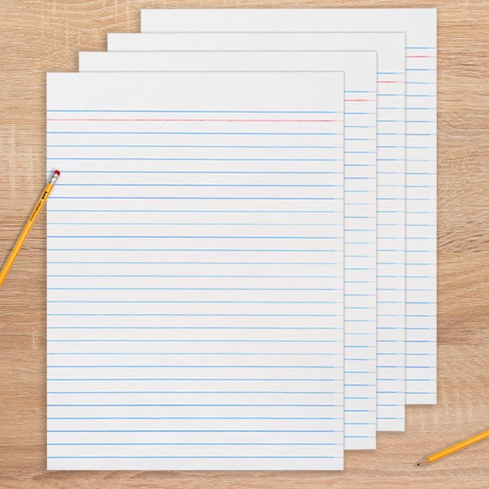 School Smart 15 lb Theme Paper, measuring 8-1/2 x 11 inches, features a red line second from the top that can be used for a title or a headline. This Sulphite theme paper with a 3/8 inch ruling on both sides is sold as 500 sheets per pack.