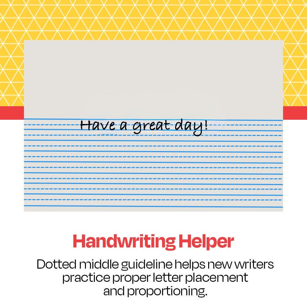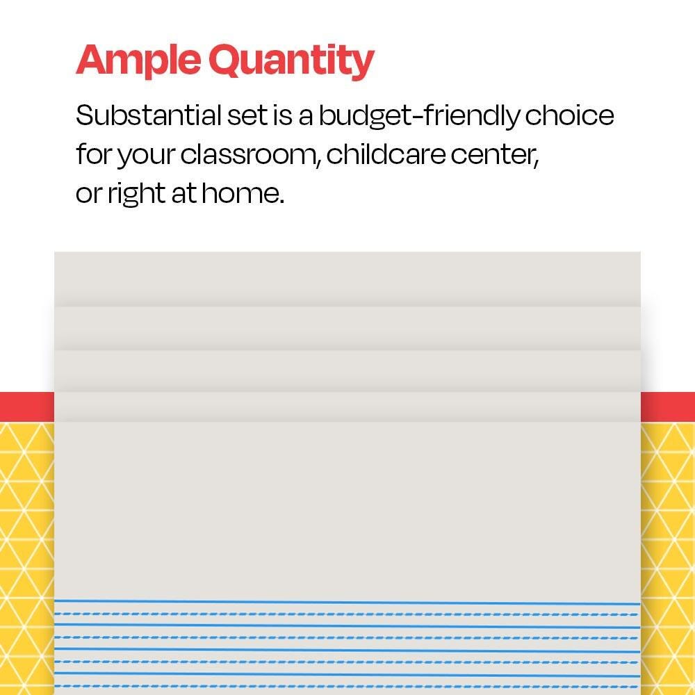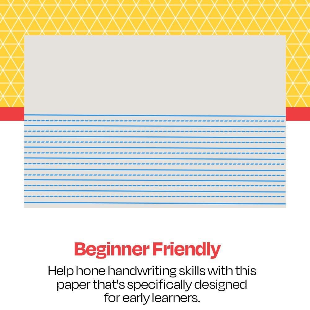 The School Smart Picture Story Alternate Ruled Paper (measuring 18 x 12 inches) has a 3/4 inch ruling with a 3/8 inch broken midline. The upper section of the paper has an approximate 6-inch space left blank for pictures and self-expression. Sold as 500 sheets per pack. Recommended for Grades K through 6.