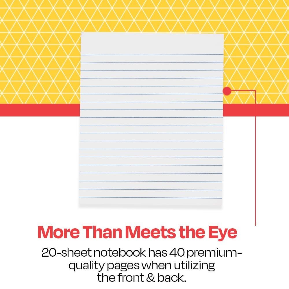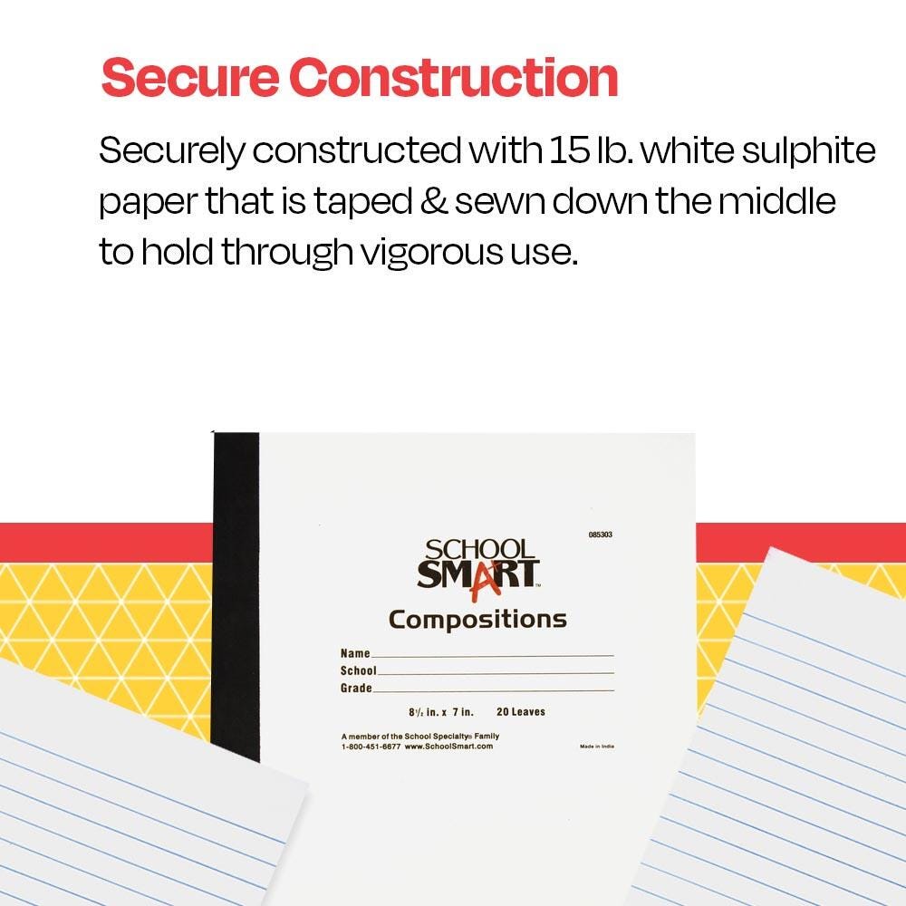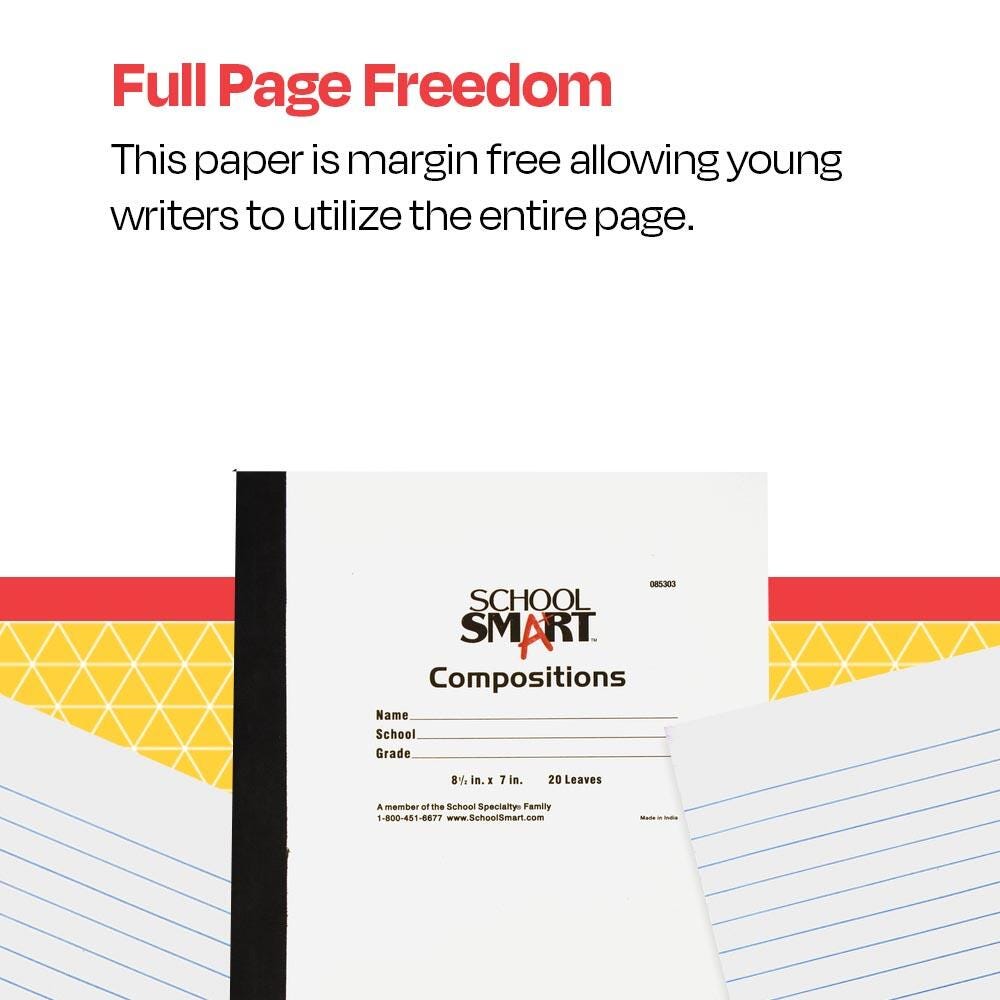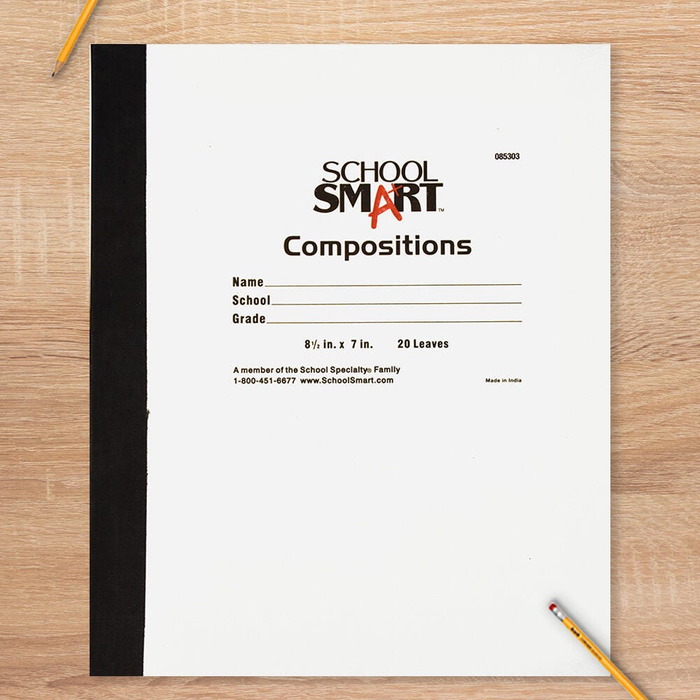 Take note! School Smart's Stitched Cover Composition Book has a plain flexible pressboard cover with square corners on the outside, and white paper with 3/8 inch ruled lines and no red margin on the inside to provide ample space for writing. Affordable composition book measures 8-1/2 x 7 inches and has 20 total sheets (40 pages if counting the front and back of sheets).