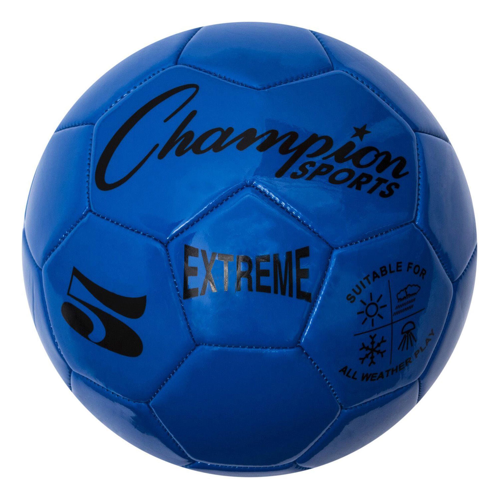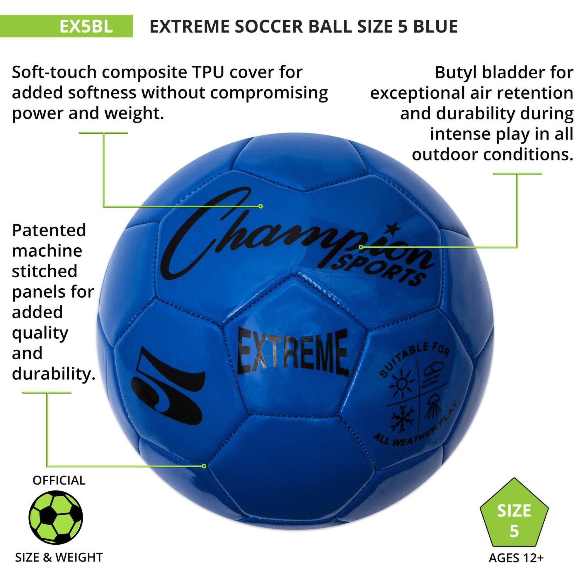 Great for recreational and competitive league games and practices in any kind of weather conditions, the Champion Sports Extreme Soccer Ball is designed with a soft-touch composite TPU cover for a soft feel without compromising the ball's weight and striking power. The butyl bladder offers exceptional air retention, and the patented machine-stitch technology of the panels offers added durability. This blue size 5 soccer ball is recommended for athletes ages 12 and up.